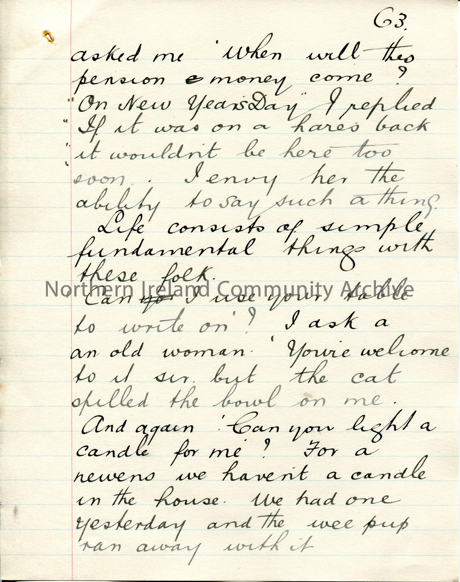 Page 63 of 71. Handwritten, rough essay [ for a talk? ] by Sam Henry titled 'Here and There in the King's Service'. Dated 1909 by JM. Sam Henry talks through his first 15 years of service as an Exciseman. He was based at Falcarragh, Ballymote in Co. Sligo, Lancashire, Uffculme and Omagh in Co. Tyrone.