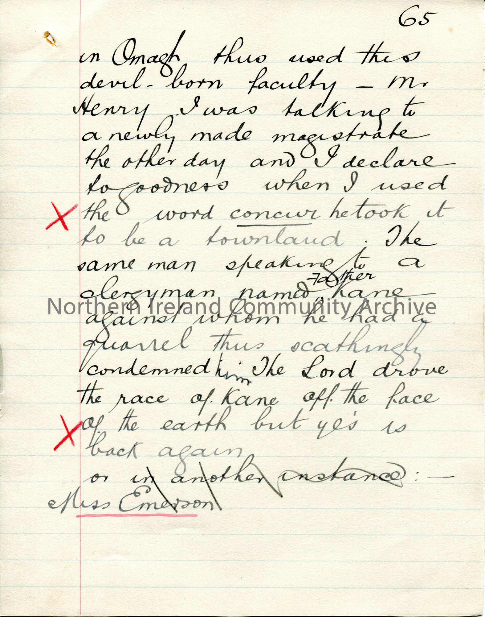 Page 65 of 71. Handwritten, rough essay [ for a talk? ] by Sam Henry titled 'Here and There in the King's Service'. Dated 1909 by JM. Sam Henry talks through his first 15 years of service as an Exciseman. He was based at Falcarragh, Ballymote in Co. Sligo, Lancashire, Uffculme and Omagh in Co. Tyrone.