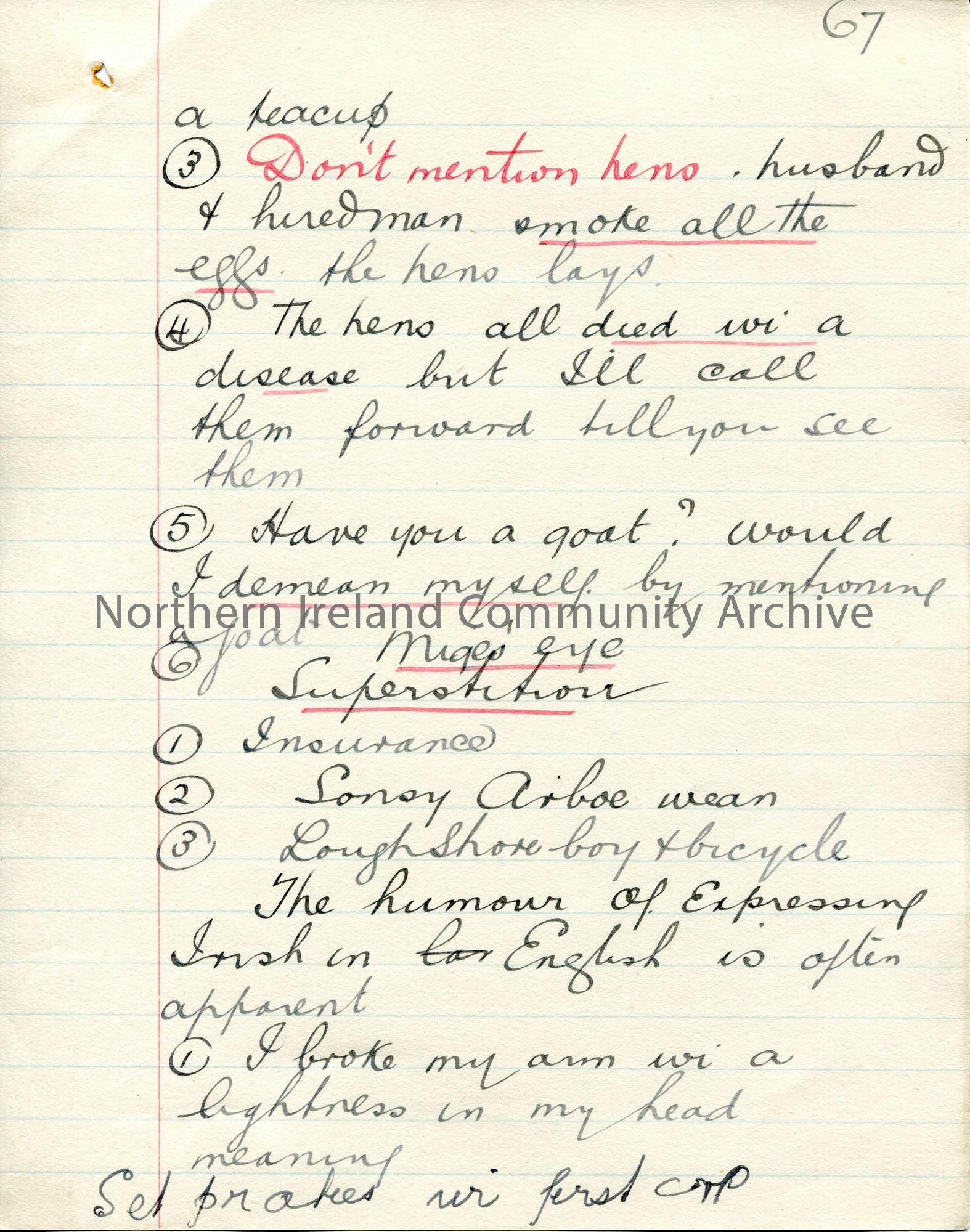Page 67 of 71. Handwritten, rough essay [ for a talk? ] by Sam Henry titled 'Here and There in the King's Service'. Dated 1909 by JM. Sam Henry talks through his first 15 years of service as an Exciseman. He was based at Falcarragh, Ballymote in Co. Sligo, Lancashire, Uffculme and Omagh in Co. Tyrone.