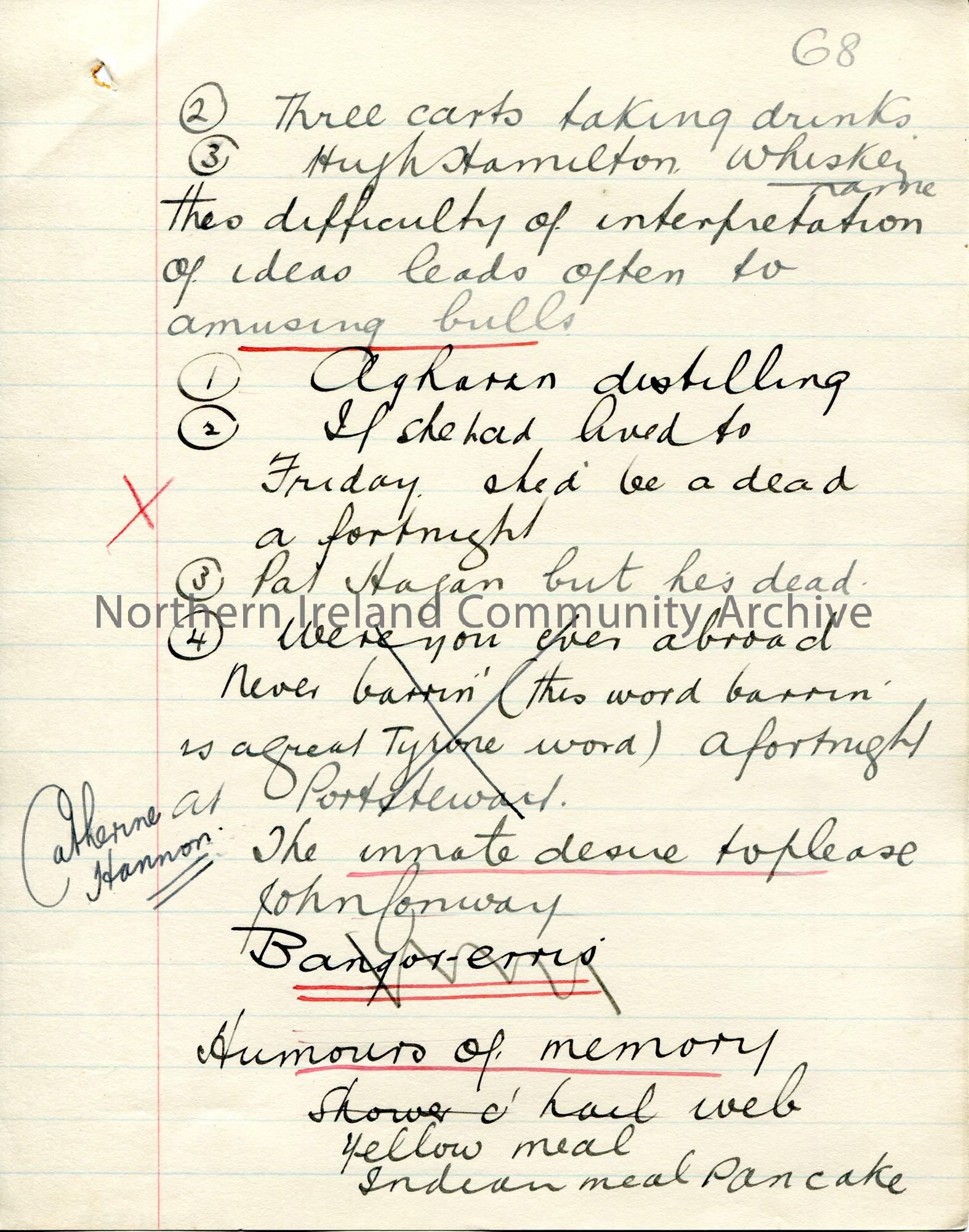 Page 68 of 71. Handwritten, rough essay [ for a talk? ] by Sam Henry titled 'Here and There in the King's Service'. Dated 1909 by JM. Sam Henry talks through his first 15 years of service as an Exciseman. He was based at Falcarragh, Ballymote in Co. Sligo, Lancashire, Uffculme and Omagh in Co. Tyrone.