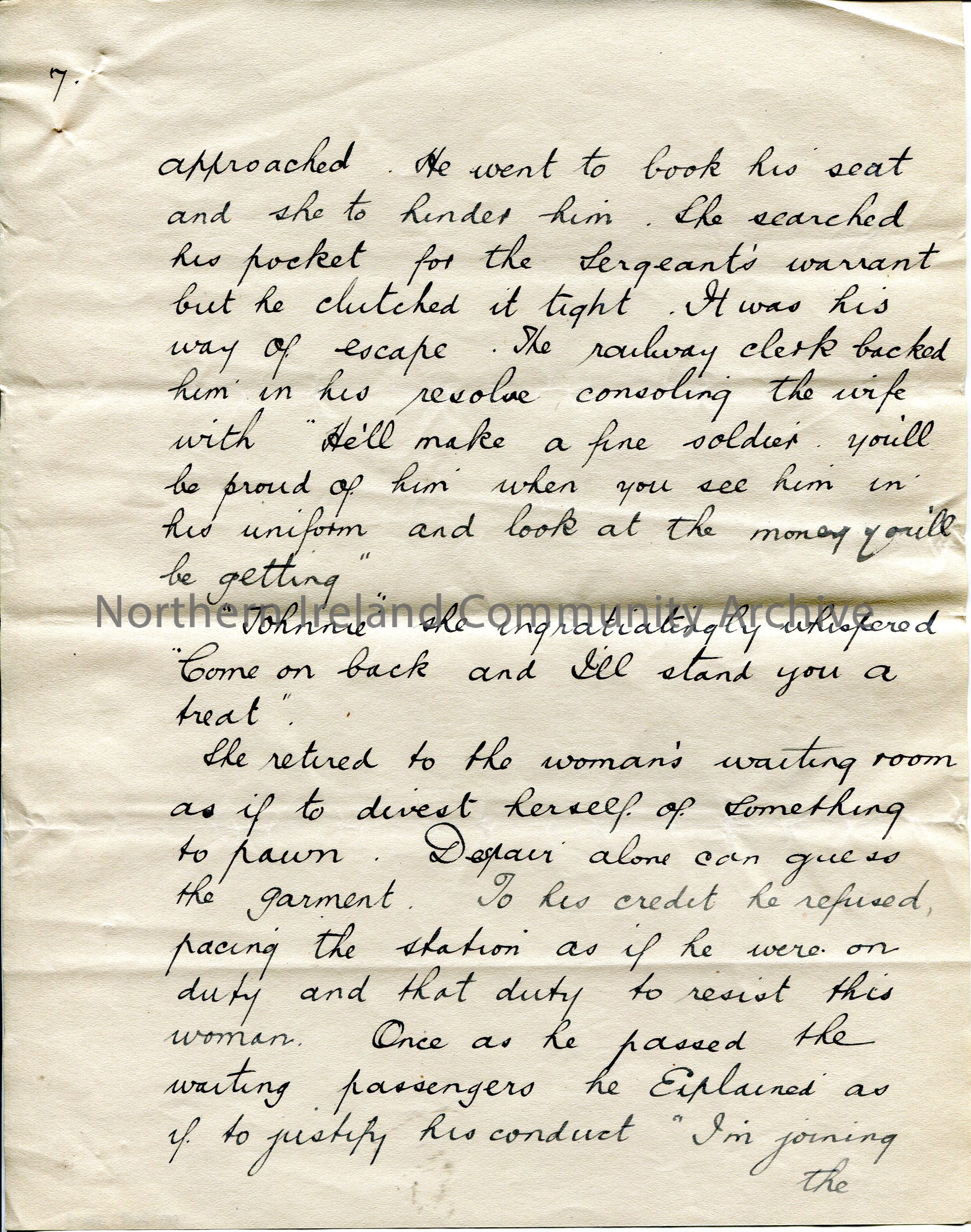 Page 7 of 10. Handwritten essay by Sam Henry titled, ‘Promotion’. Re witnessing a man departing at a station as a soldier for war [WWI] and his wife w…