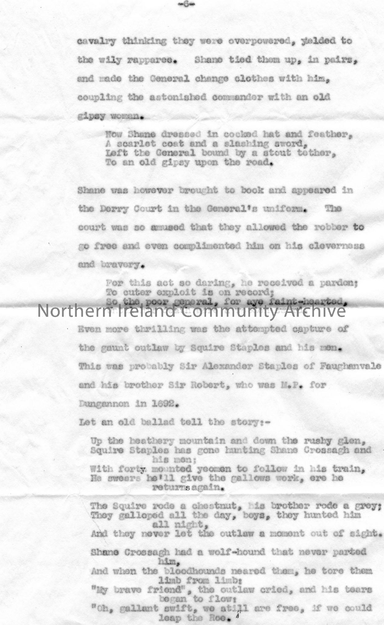 Page 7 of 11 typed script for broadcast titled, 'Irish Highwaymen and Tories. Shane Crossagh'. By Sam Henry. Saturday 26th February 7.5 - 7.20pm. Various stories involving Shane Crossagh - the Derry Rapparee.
