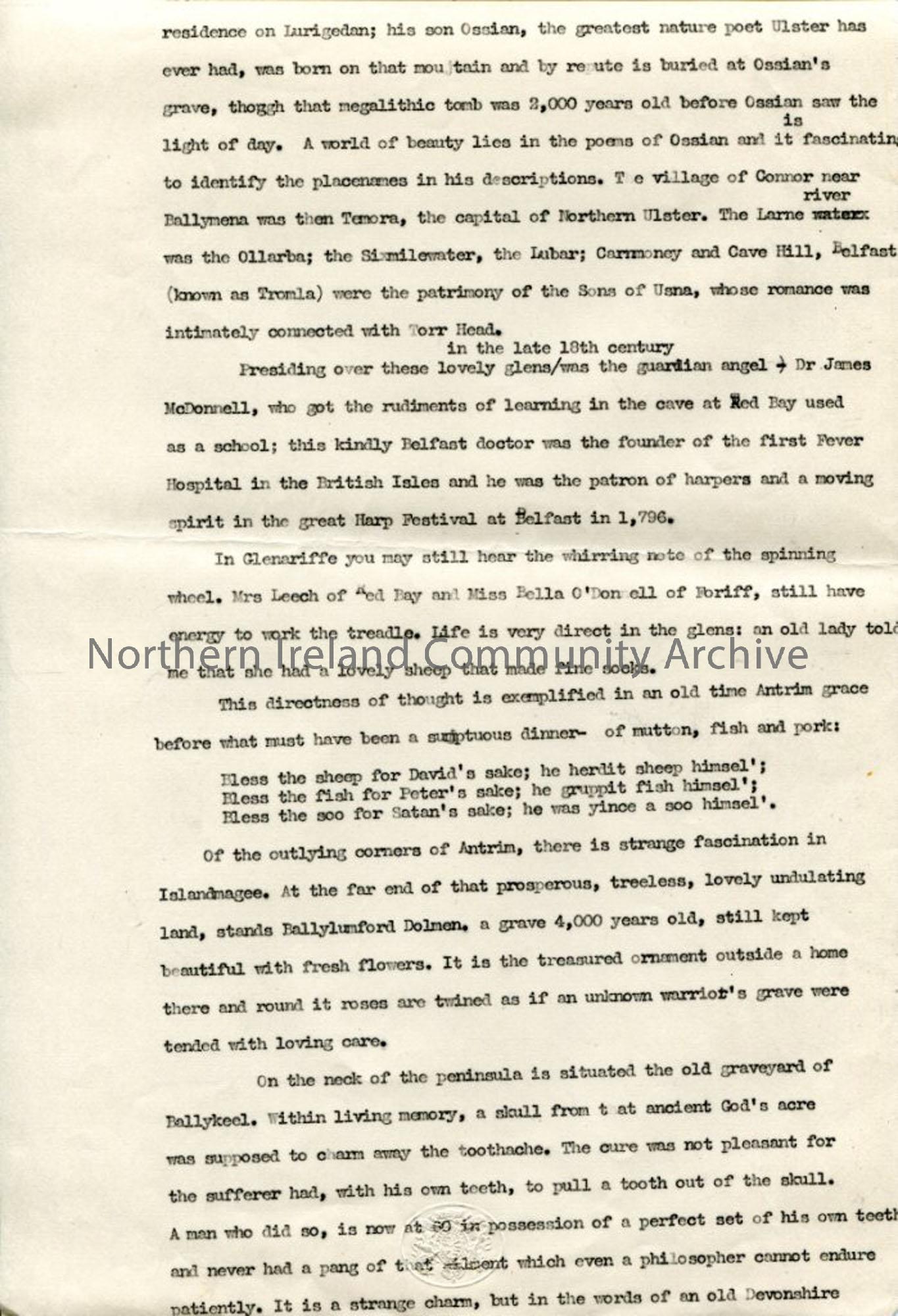 Page 7 of 13 pages of typed script, with handwritten corrections, under heading 'Undiscovered Ulster - Co. Antrim'. Some information is repeated - possibly a mixture of 2 scripts. Includes close relationship between North Antrim and Hebrides, with Islay funerals taking place in Dunseverick. Last 3 pages have heading 'Additional notes to be worked in to script'. Descriptive historical trip through various locations in County Antrim, with factual and folklore stories and customs.