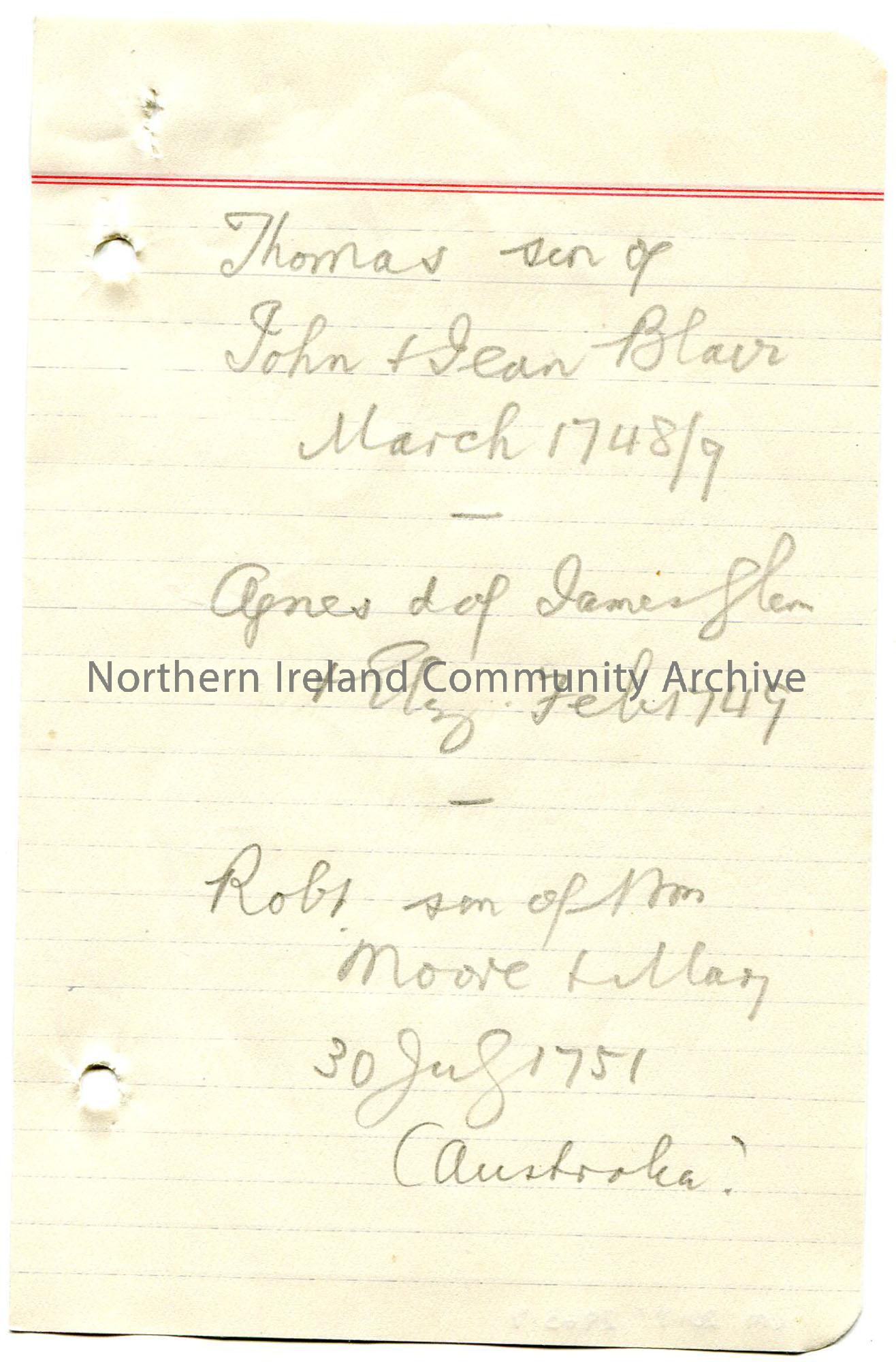 Page 7 of 15. Rough genealogical notes on lined paper in pencil from a notebook re Sam’s ‘Blair Inquiry’. Mentions Hugh Blair and John Blair. ‘Record …