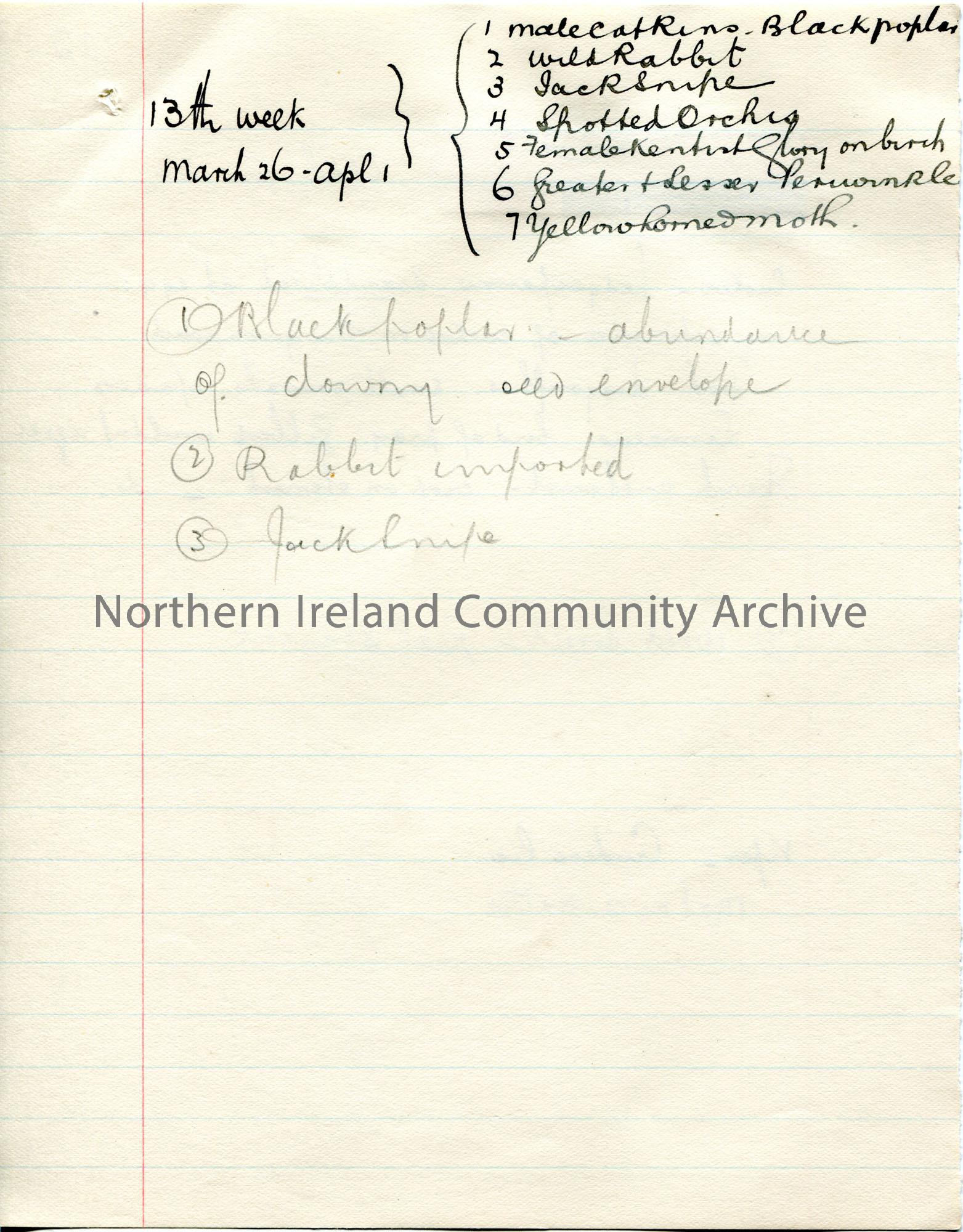 Page 7 of 26. Handwritten nature notes (double sided). Details correspond to each week of the year. Small cuttings from a publication are pasted to so…