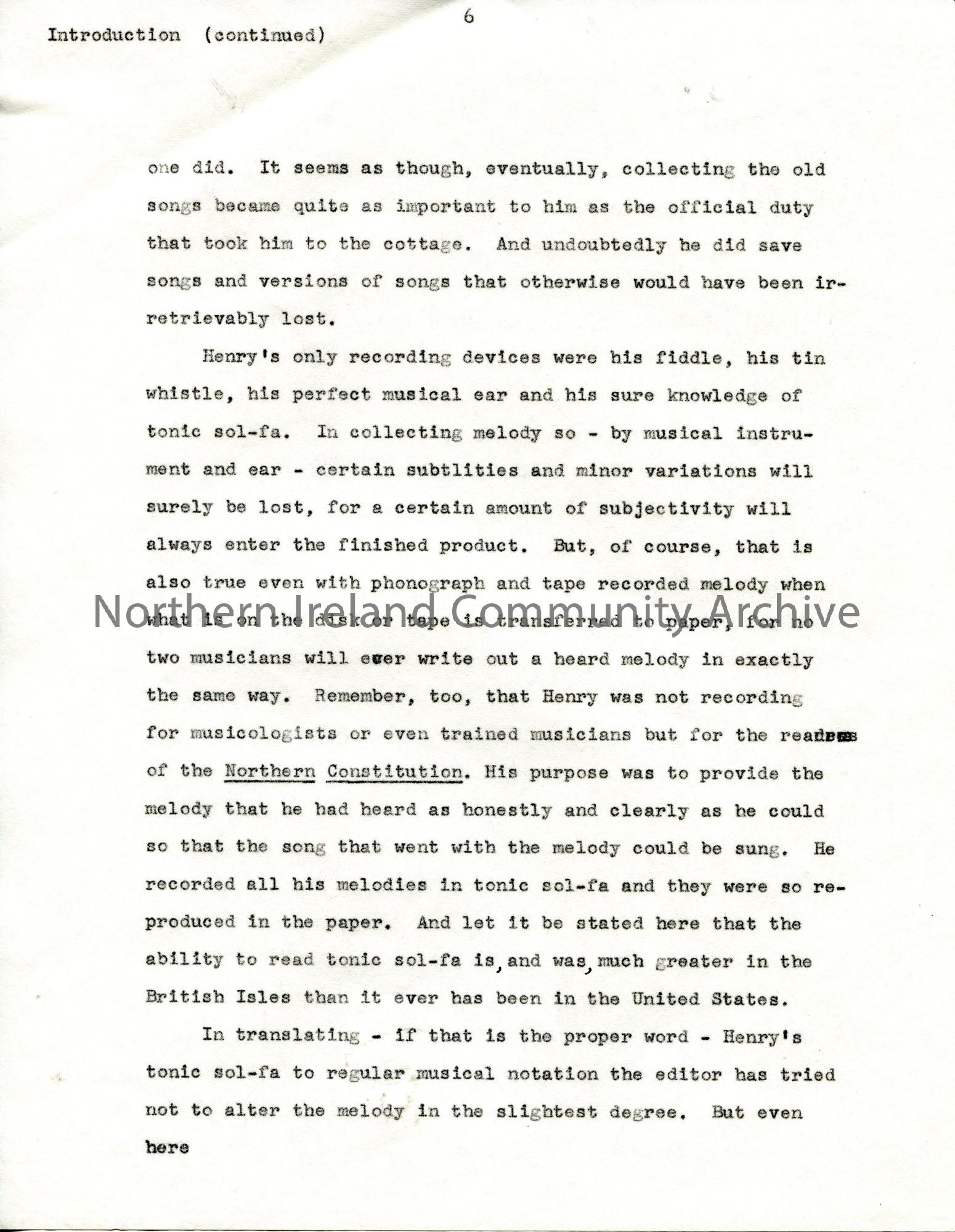Page 7 of 28. Typed manuscript for Sam Henry's Songs of the People edited by Gale Huntington. Annotated in black ink. Includes the introduction, text re Child Ballads, Laws Ballads, Other Ballads, Songs and Ballad-Like Songs, Chanteys, Lullabys and Signing Games, Bibliography and Index.
