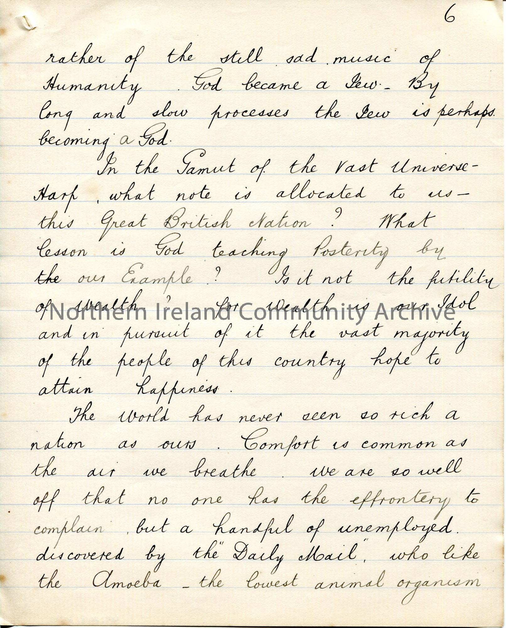 Page 7 of 39. Handwritten essay by Sam Henry titled, ‘The Cult of Comfort’. Title is scored out. Dated Omagh, December 1905. Religious, philosophical …