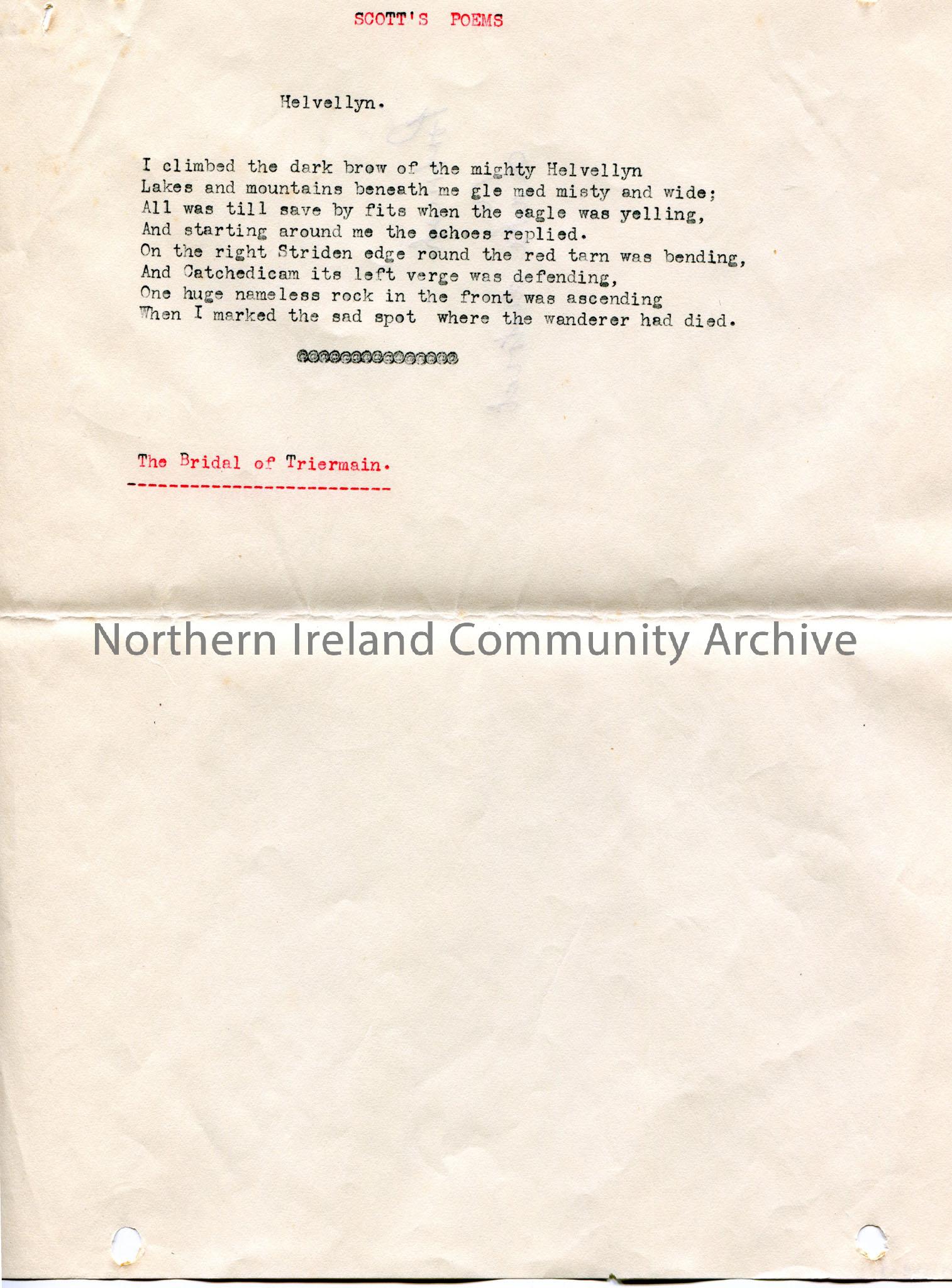 Page 7 of 7 of typed notes re lecture titled, 'The English Lakes' at Portrush on 15th February 1935. Typed page titled, 'Scott's Poems'. One poem titled, 'Helvellyn'.