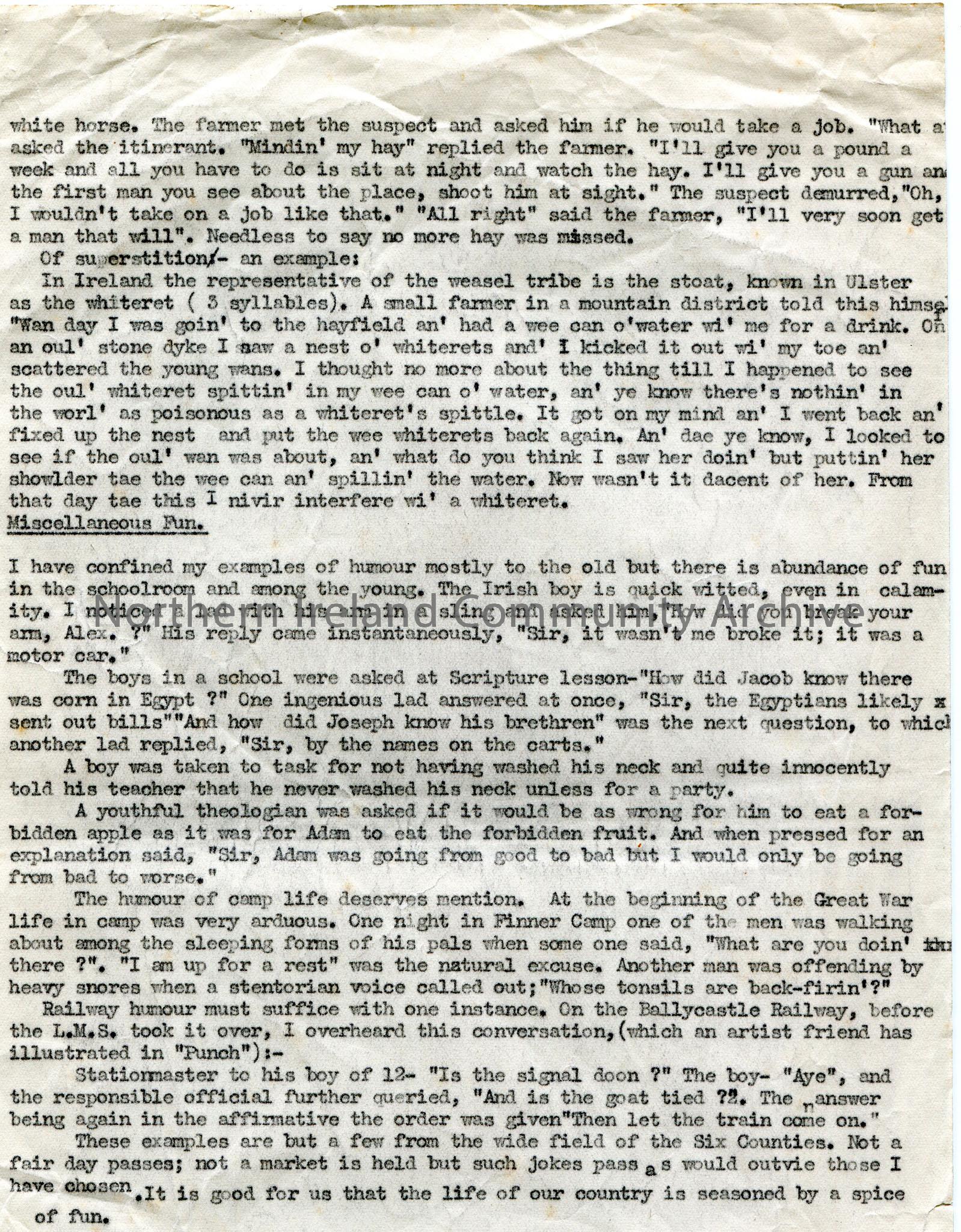 Page 7 of 7 of typed talk for broadcast titled, 'Wit on the Wireless; a Radio Talk given from Northern Ireland on 7th September 1925'. Humorous talk re stories and folklore in Ulster, spoken in Anglo-Irish and Anglo-Scottish.