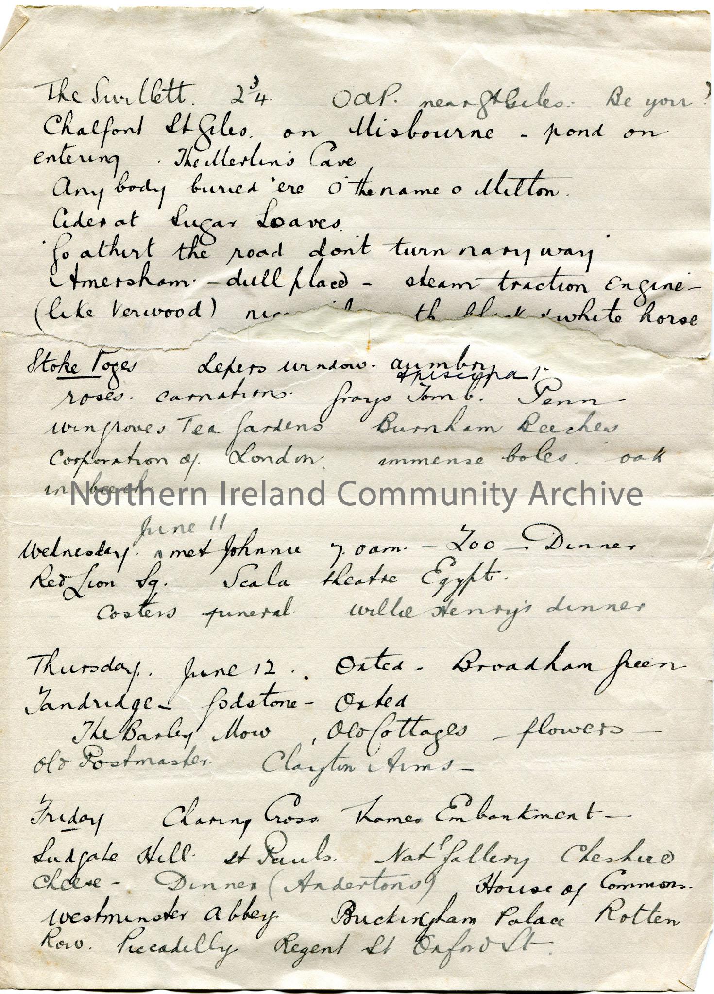 Page 7 of 8 of handwritten notes titled, ‘Holiday 31 May-19 June 1913’. Details of daily activities of travels around England.