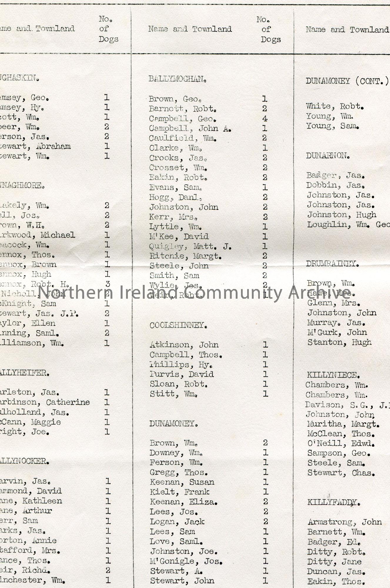 Page 7 of 9. Dogs Regulation (Ireland) ACTS, 1865 & 1919. Typed list of persons who have taken out licences in Magherafelt in the Barony of Loughinsho…
