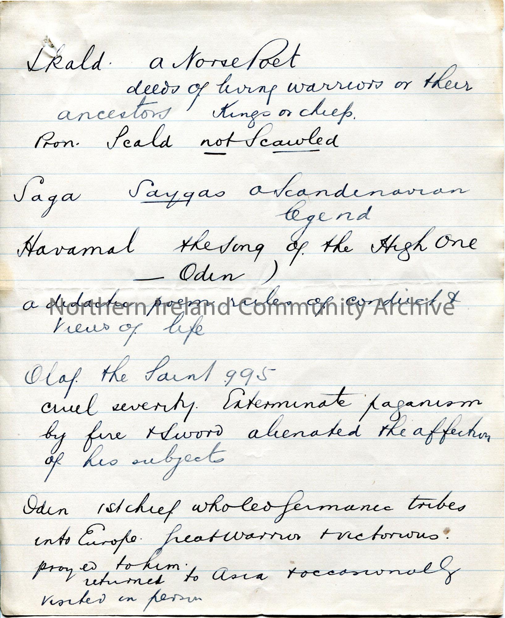 Page 8 of 10. Handwritten essay and rough notes. Title scored out ‘The Wrath of Odin’. Re the origin and history of Odin in the understanding the mean…