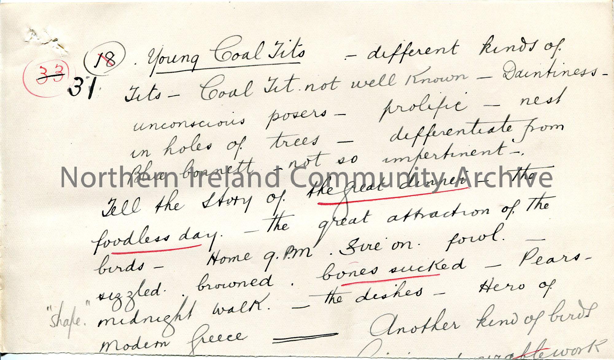 Page 8 of 10. Handwritten rough notes for lecture by Sam Henry titled, ‘On way to Lough na Tarpoge’. Notes are numbered for slides 3-41. Re a nesting …