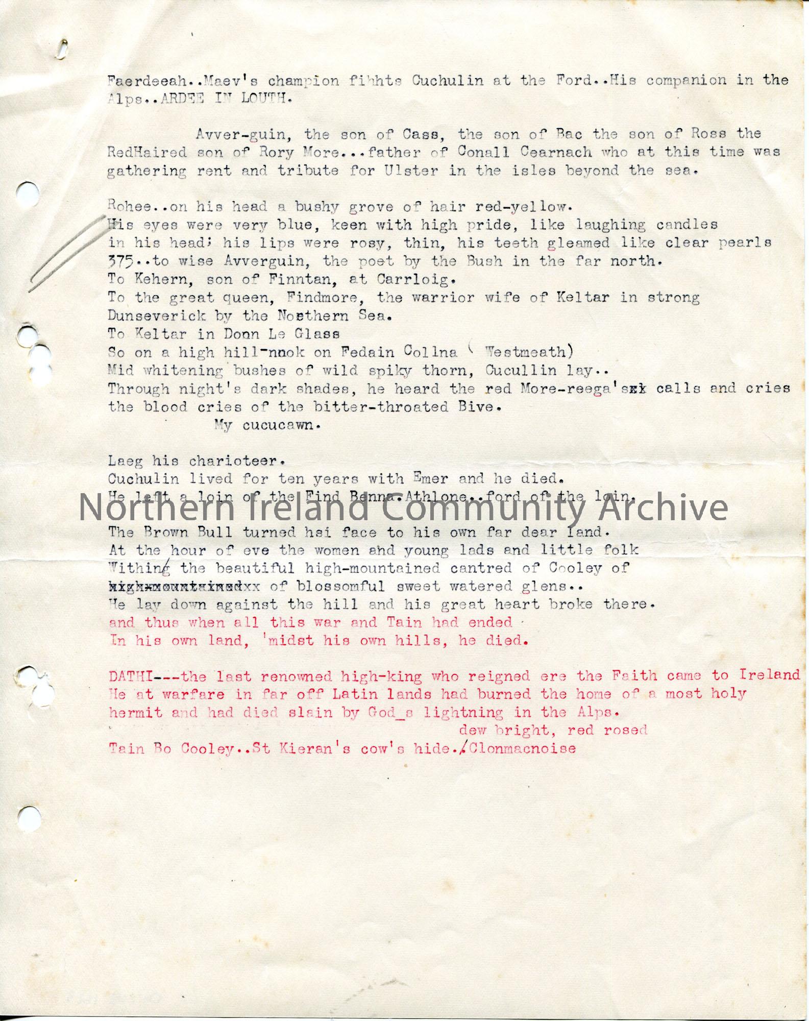 Page 8 of 10. Typed notes for lecture 'The Glory that was Ulster' given by Sam Henry at an 'Old Wolves Conference - Campbell College' on 2nd August 1936. Notes titled, 'The Tain Bo Cuailgne'. [The Cattle Raid of Cooley].