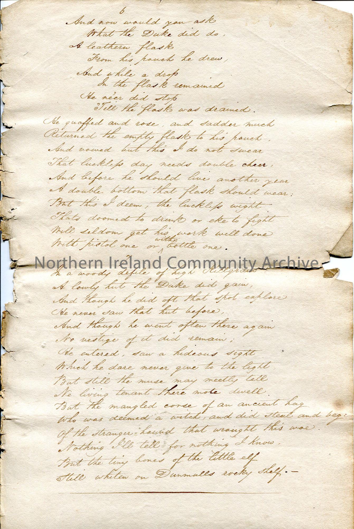Page 8 of 12. Handwritten verses of poetry. Some of which are untitled. Titled pieces - 'The Emigration', 'L'Amour' Translated from the French 1814, 'The Shift' 1812, 'The Stranger-Hound. A Dunmull Legend' 1812, 'Impromptu, On my Birthday' 21st December 1809, 'To My Flute' 1807, 'Prologue to Speed the Plough' 1806 and 'Occasional Address. Spoken at the opening of the private theatre, Colerain' 1806.