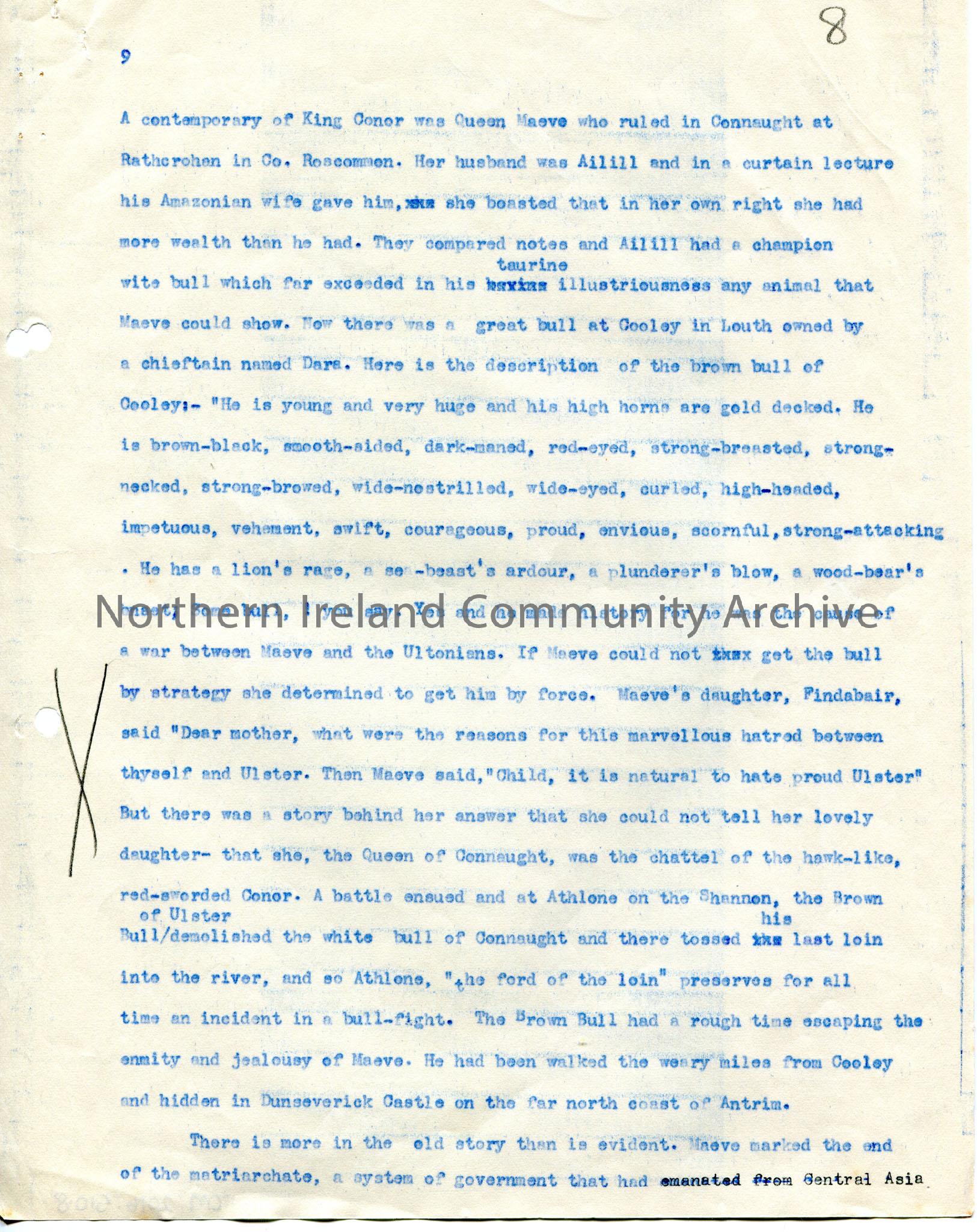 Page 8 of 13 of typed notes, possibly a script re tracing the evolution of the Irish people geologically. Mentions various people and places in Ireland. Pages numbered in pencil. Annotated in pencil throughout pages.