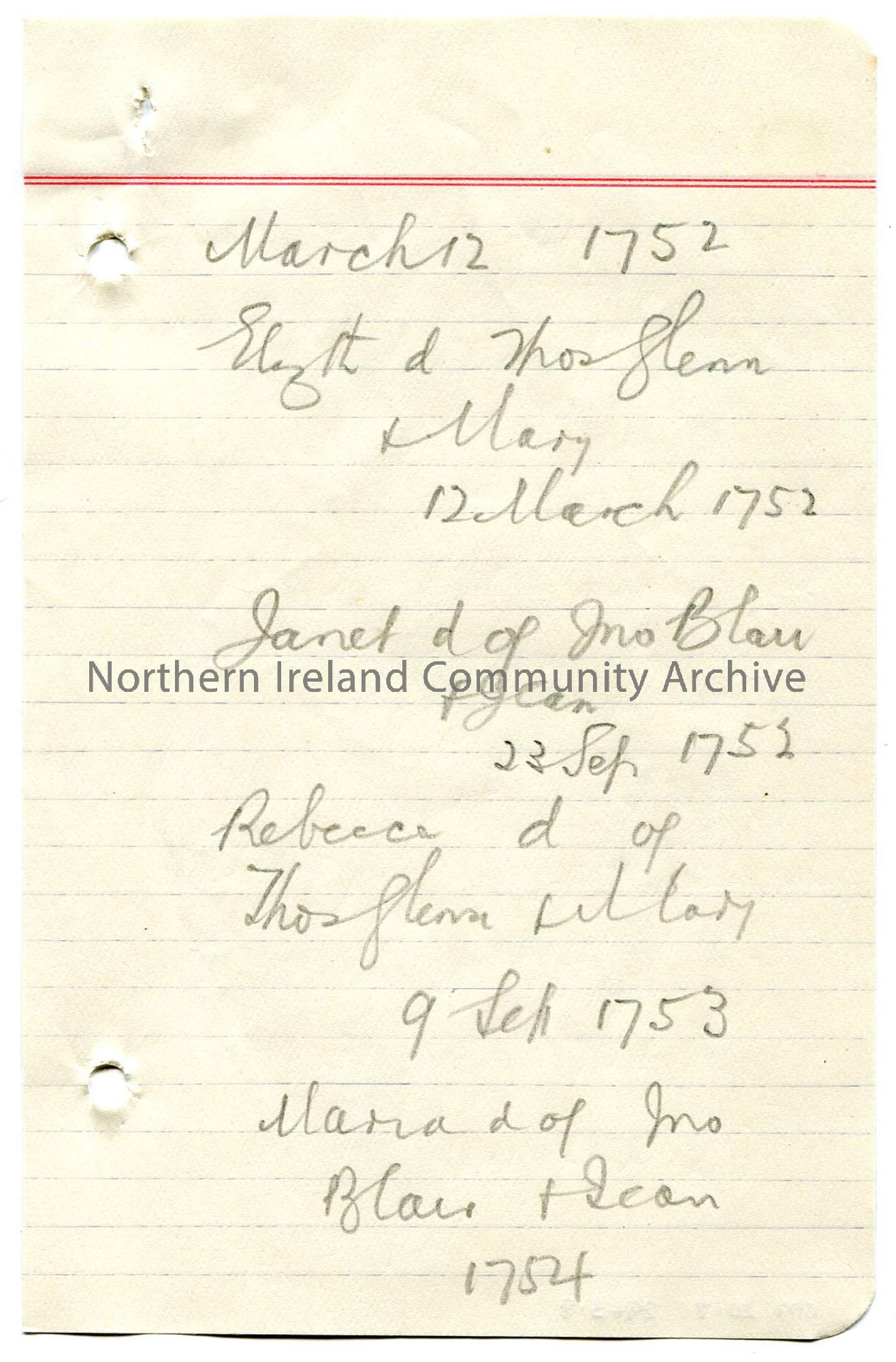 Page 8 of 15. Rough genealogical notes on lined paper in pencil from a notebook re Sam’s ‘Blair Inquiry’. Mentions Hugh Blair and John Blair. ‘Record …