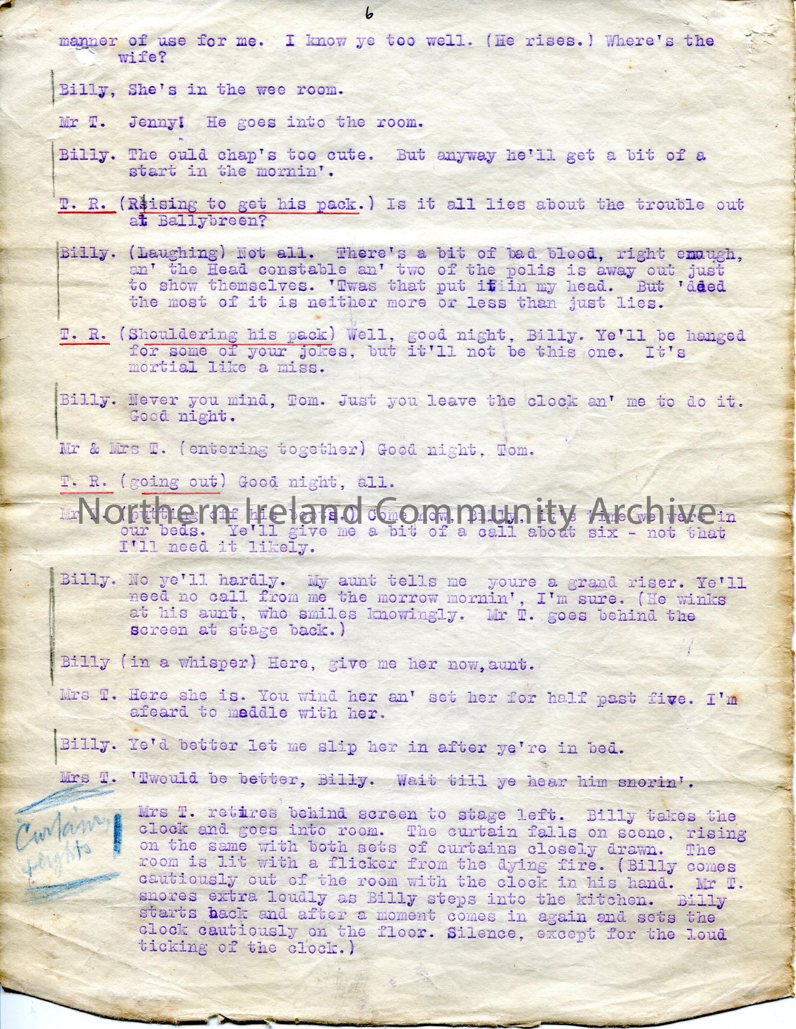 Page 8 of 16. Typed script for play ‘The Alarm Clock. A farce in one act by Lynn Doyle’. Re an alarm clock which is mistaken for an explosive device.