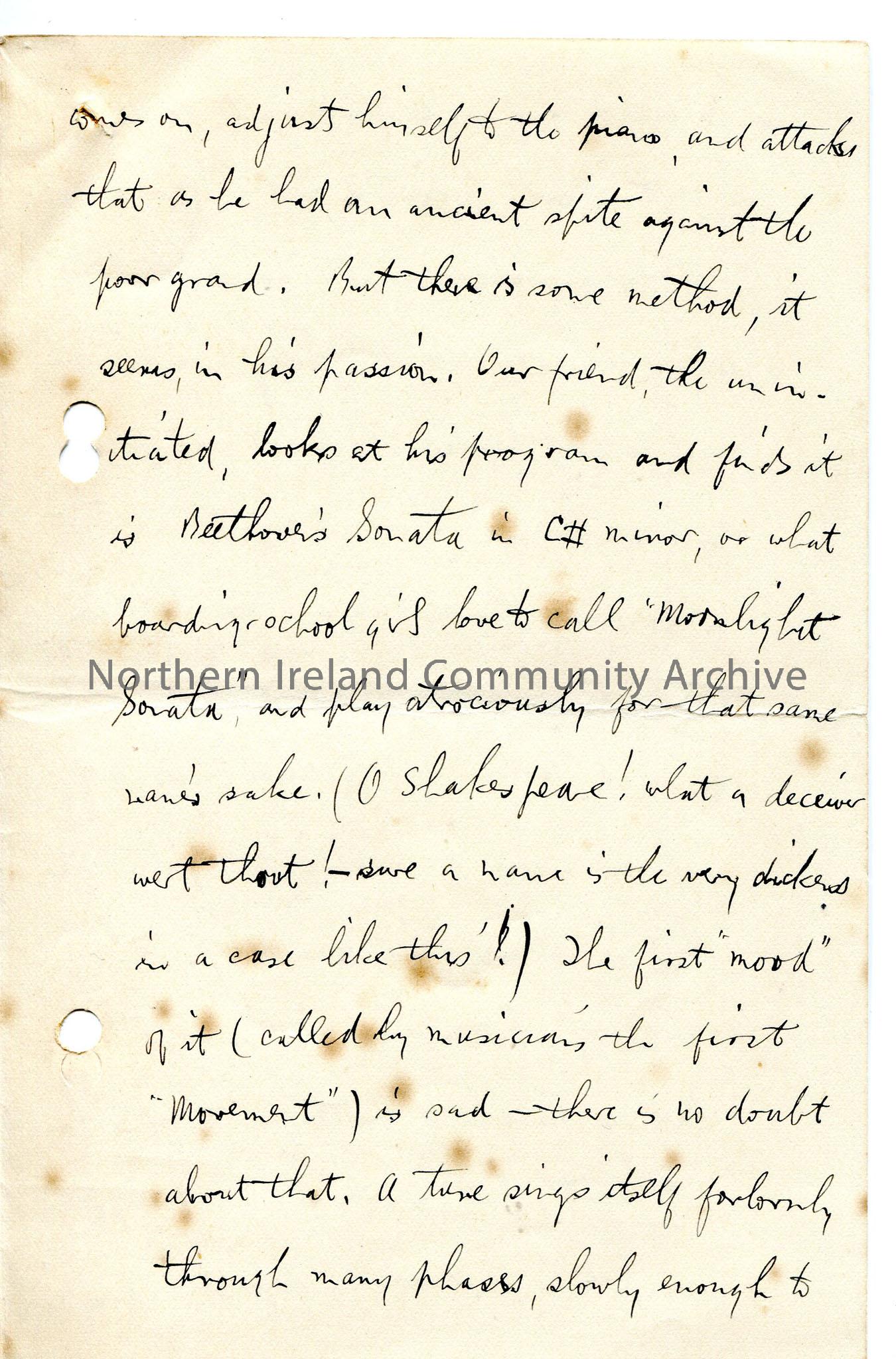 Page 8 of 24 page handwritten letter, on both sides of paper - author appears to have left Coleraine and now live in Glasgow. Mentions Irish Society School. Writes about classical music, Ibsen plays, a fanciful sketch his own, and Irish theatre, writers and myths and legends.