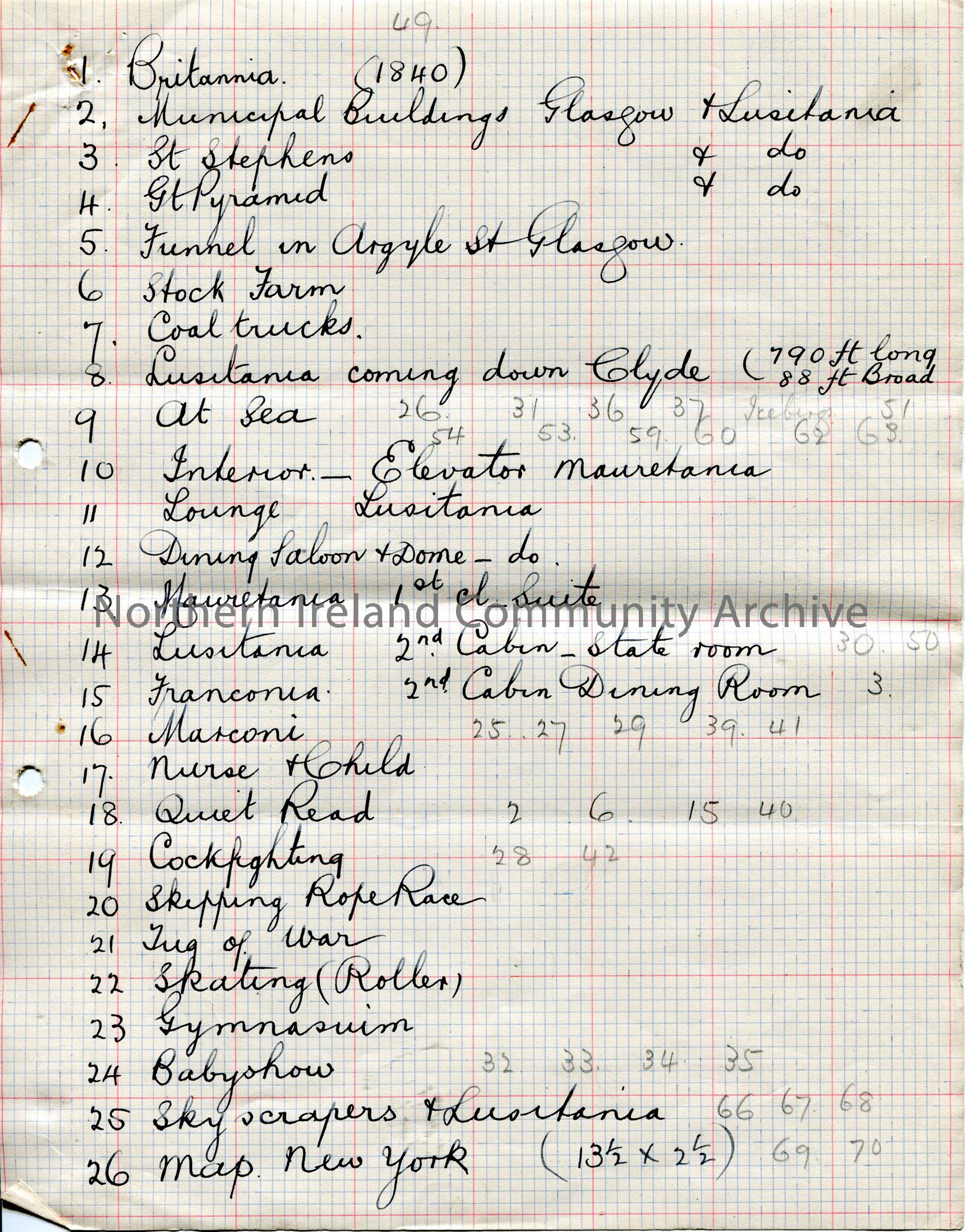 Page 8 of 27. Handwritten list of names of possible photographs/slides numbered 1-95. Begins with Britannia (1840) and ends with ‘At Sea Again’. Some …