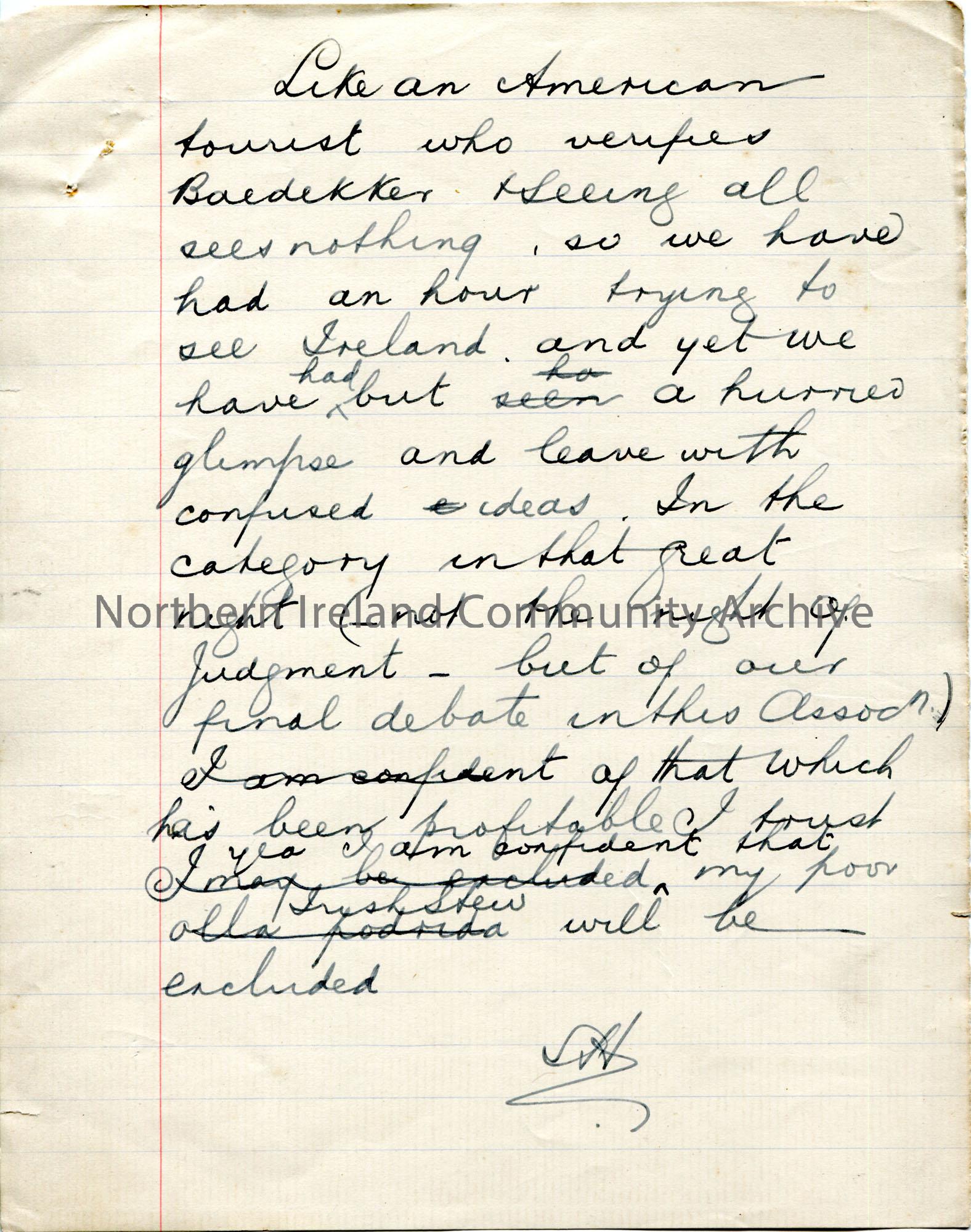 Page 8 of 8. Handwritten notes as part of several pages for an evening of entertainment by Sam Henry at the meeting of New Row Association on 7th February 1911. Titled, 'An Irish Miscellany'. Re characters Sam has met in various parts of Ireland - Jane Kerr, John Taggart, Bernard O'Neill, John Wright, Francis McDonald, Katie Fullan, John Gartland, Sarah Agnew, John Ryan . Includes an itinerary of the evening performance.