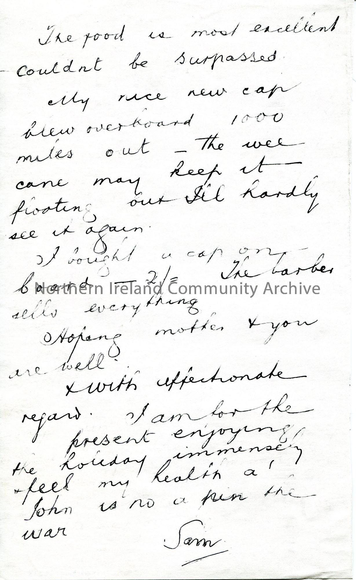 Page 8 of 8. Photocopy of a letter to Maggie from Sam Henry. Writing on board S S Furnessia. Sam is travelling with his Uncle John from Moville to New York. Writes of his sickness, involvement in on board concerts, bird life, keeping a diary, general life at sea.
