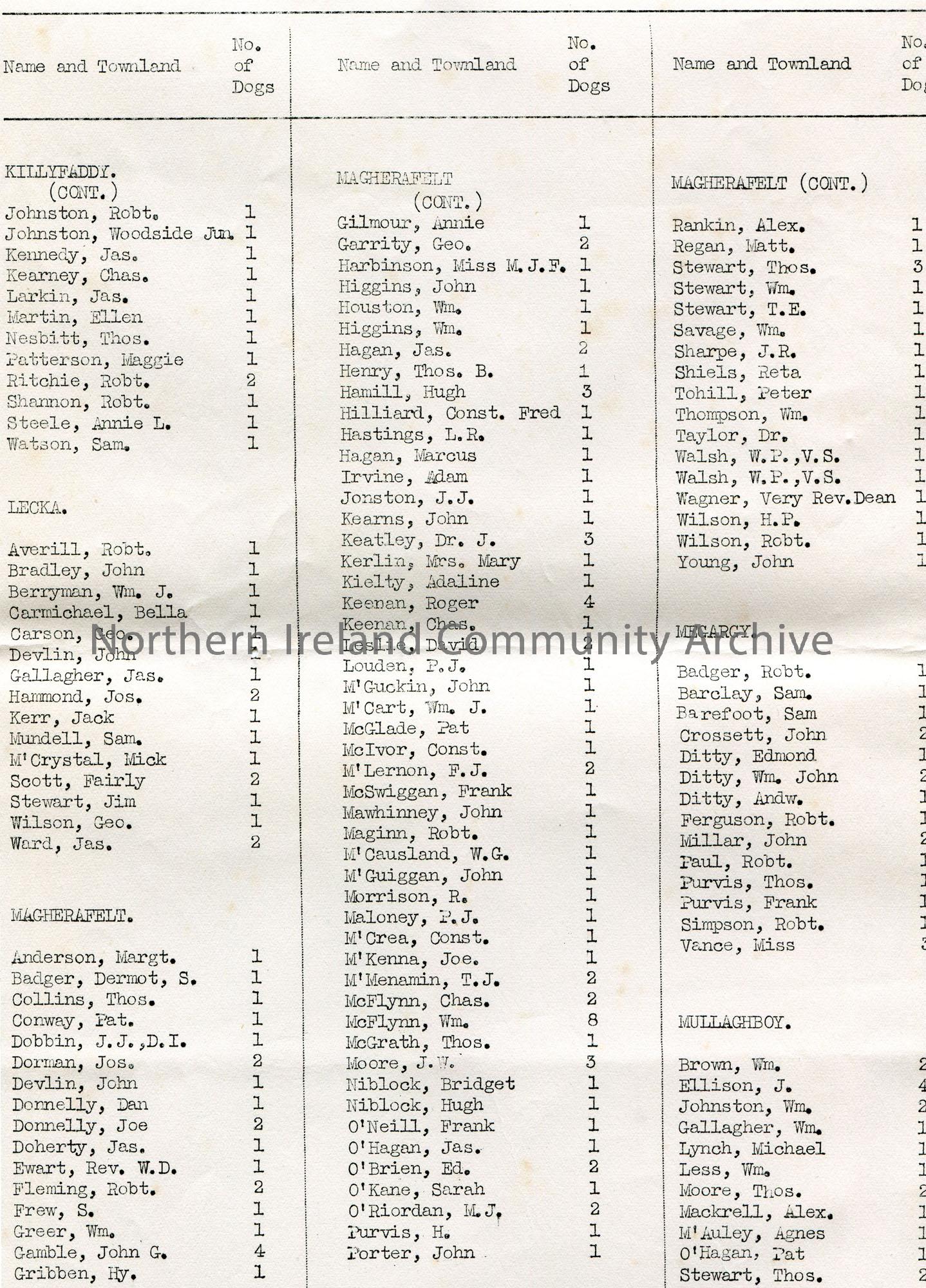 Page 8 of 9. Dogs Regulation (Ireland) ACTS, 1865 & 1919. Typed list of persons who have taken out licences in Magherafelt in the Barony of Loughinsho…