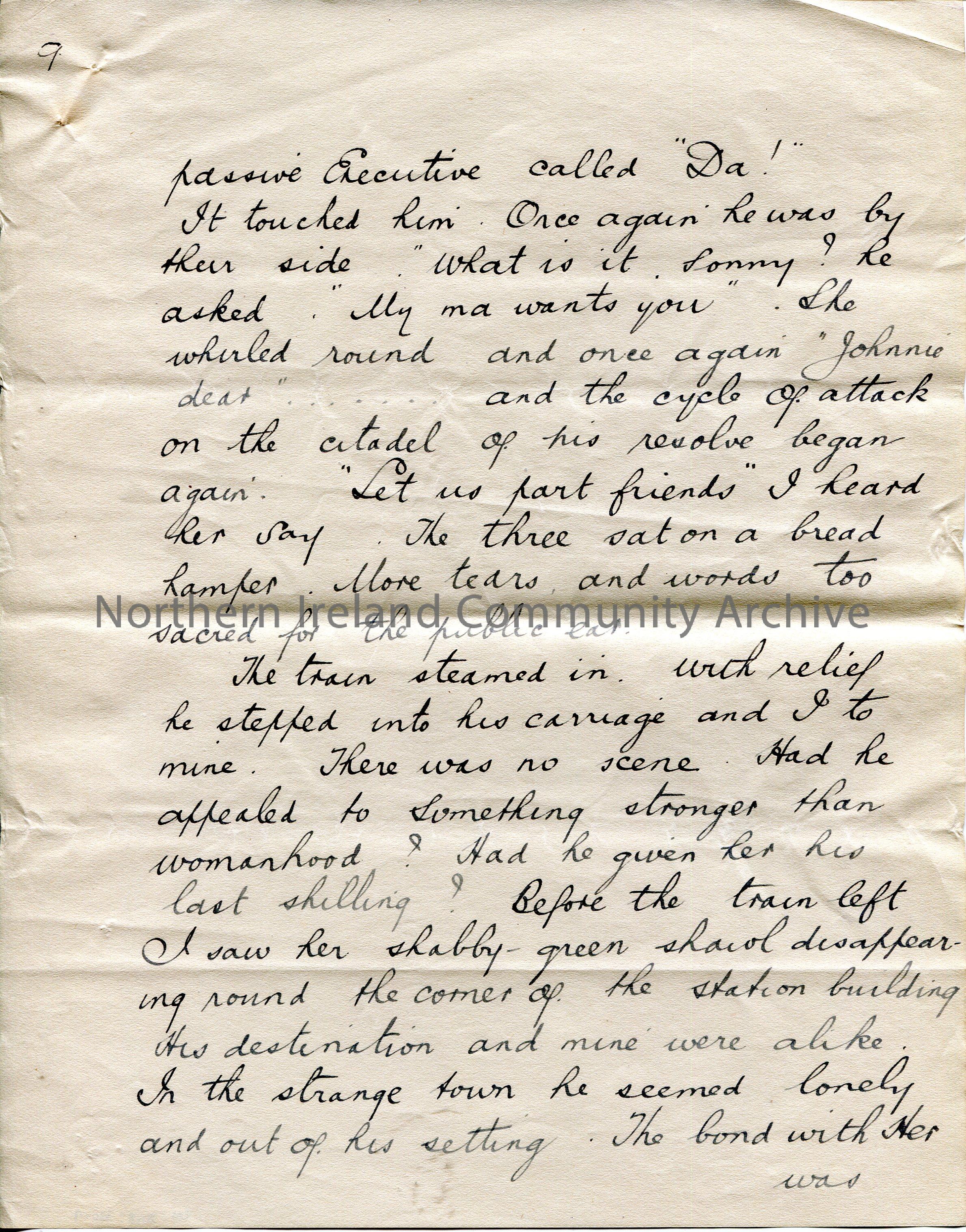 Page 9 of 10. Handwritten essay by Sam Henry titled, ‘Promotion’. Re witnessing a man departing at a station as a soldier for war [WWI] and his wife w…