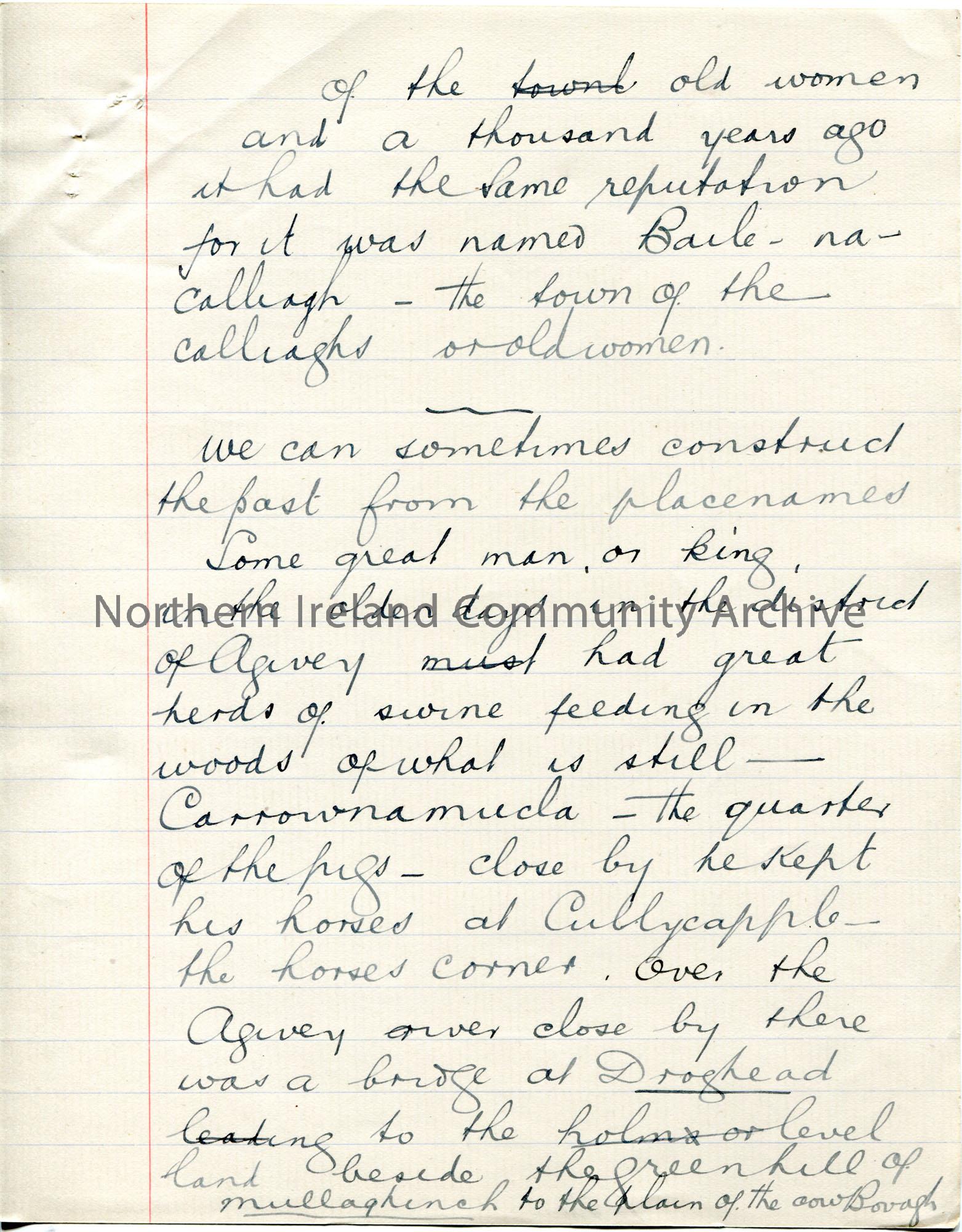 Page 9 of 10. Handwritten notes titled, 'A Walk with the Old Name Makers'. '7.38 10 minutes' handwritten and scored out on front page. Covers Irish placenames and their meaning/history. Mentions Killowen, Farranlester, Dundurg, Ballinteer, Farranseer, Masteragwee, Mullanhead, Ballycairn, Coleraine, Aghadowey, Agivey, Carrownamucla, Cullycapple, Droghead, Bovagh, Drumcroon, Knockertolan.