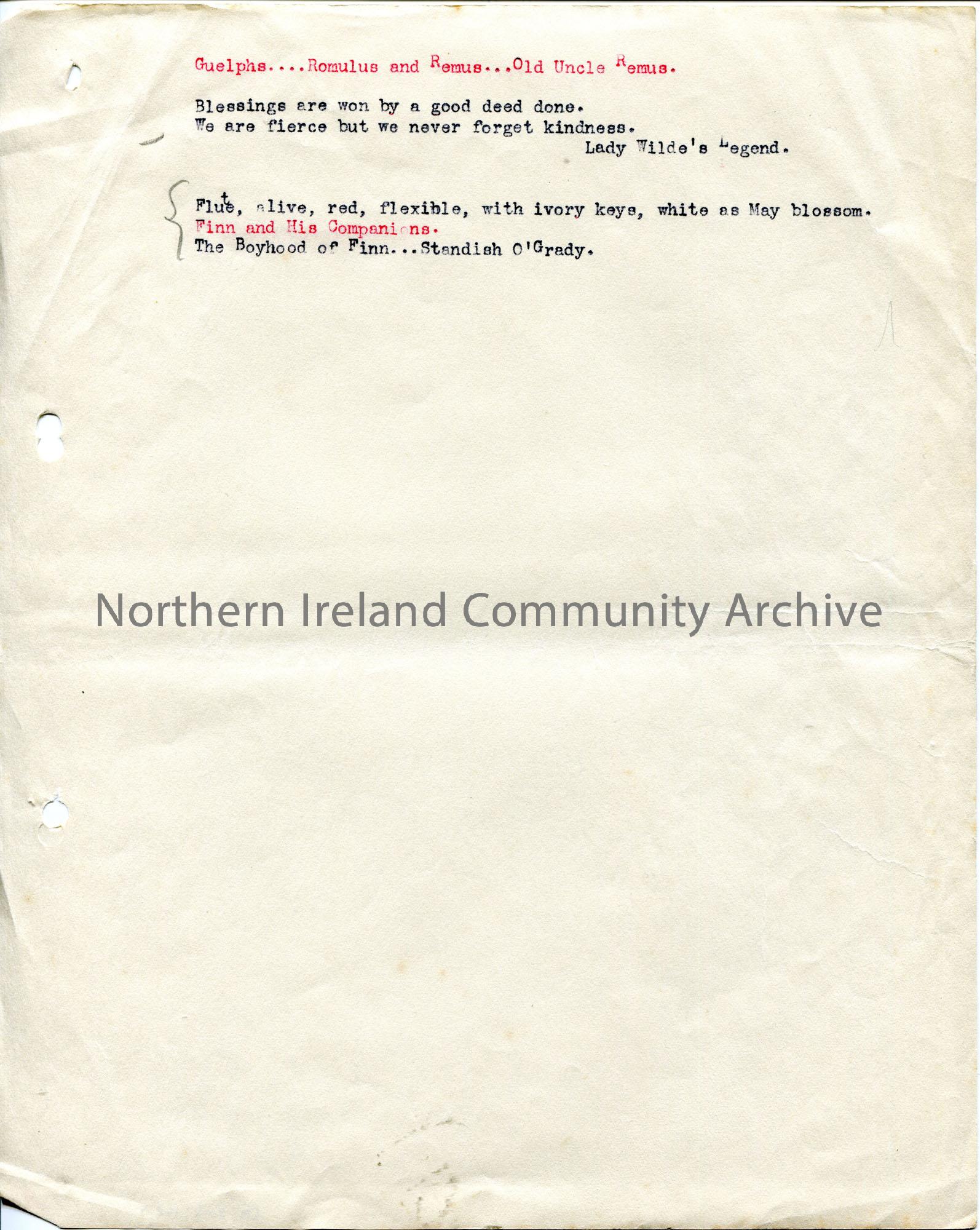 Page 9 of 10. Typed notes for lecture ‘The Glory that was Ulster’ given by Sam Henry at an ‘Old Wolves Conference – Campbell College’ on 2nd August 19…
