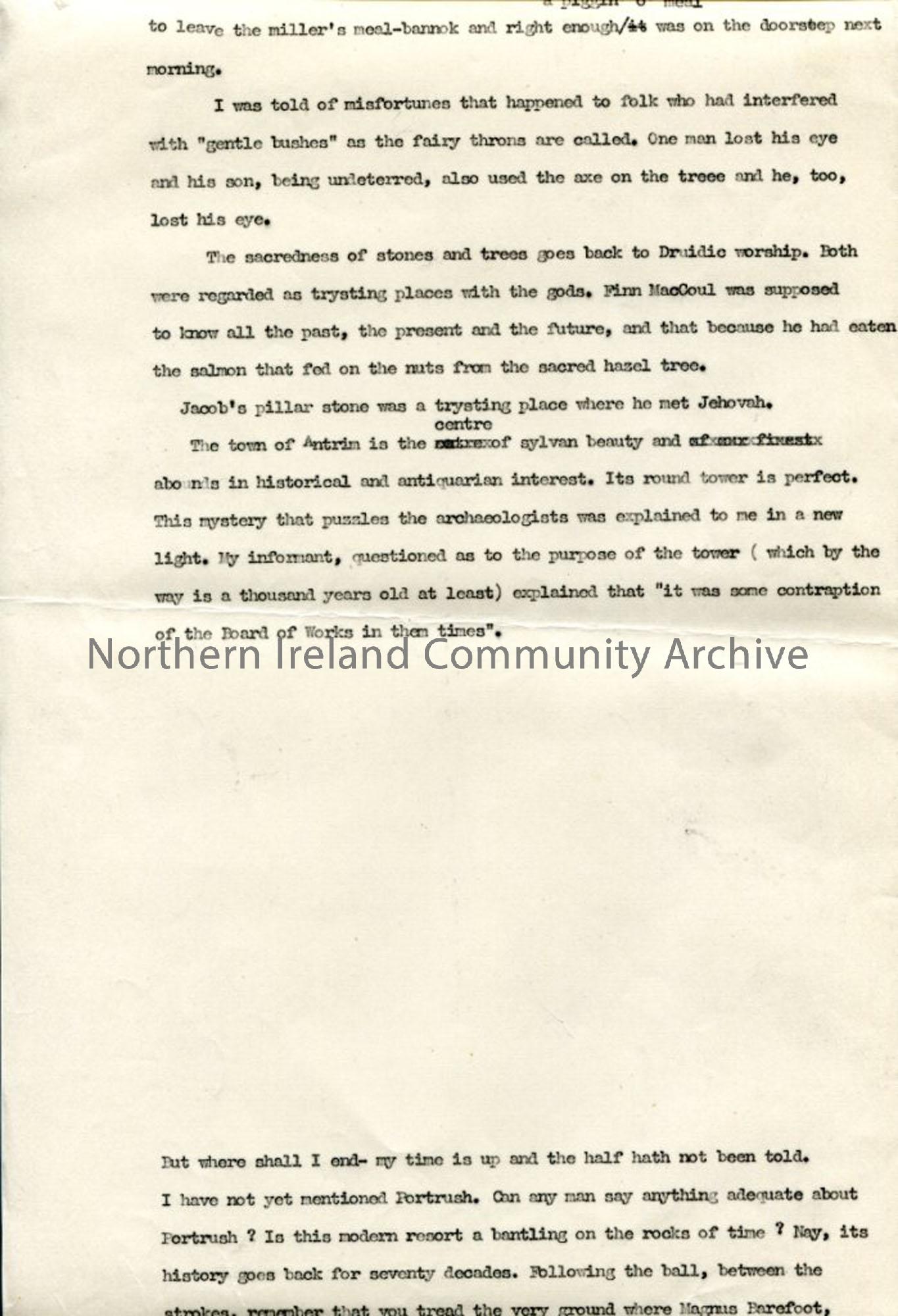 Page 9 of 13 pages of typed script, with handwritten corrections, under heading 'Undiscovered Ulster - Co. Antrim'. Some information is repeated - possibly a mixture of 2 scripts. Includes close relationship between North Antrim and Hebrides, with Islay funerals taking place in Dunseverick. Last 3 pages have heading 'Additional notes to be worked in to script'. Descriptive historical trip through various locations in County Antrim, with factual and folklore stories and customs.