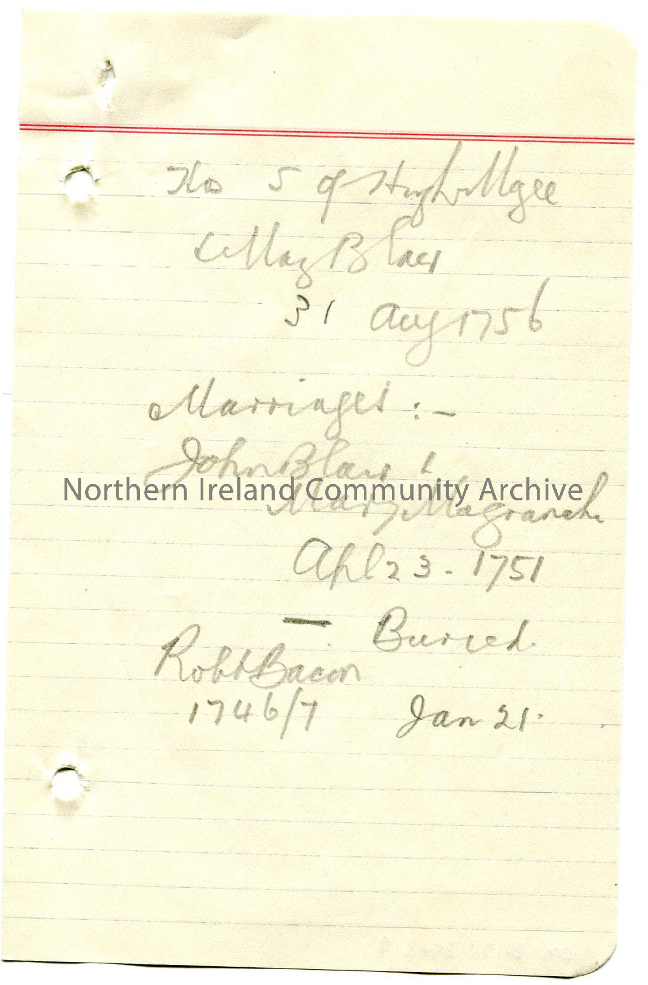 Page 9 of 15. Rough genealogical notes on lined paper in pencil from a notebook re Sam’s ‘Blair Inquiry’. Mentions Hugh Blair and John Blair. ‘Record …
