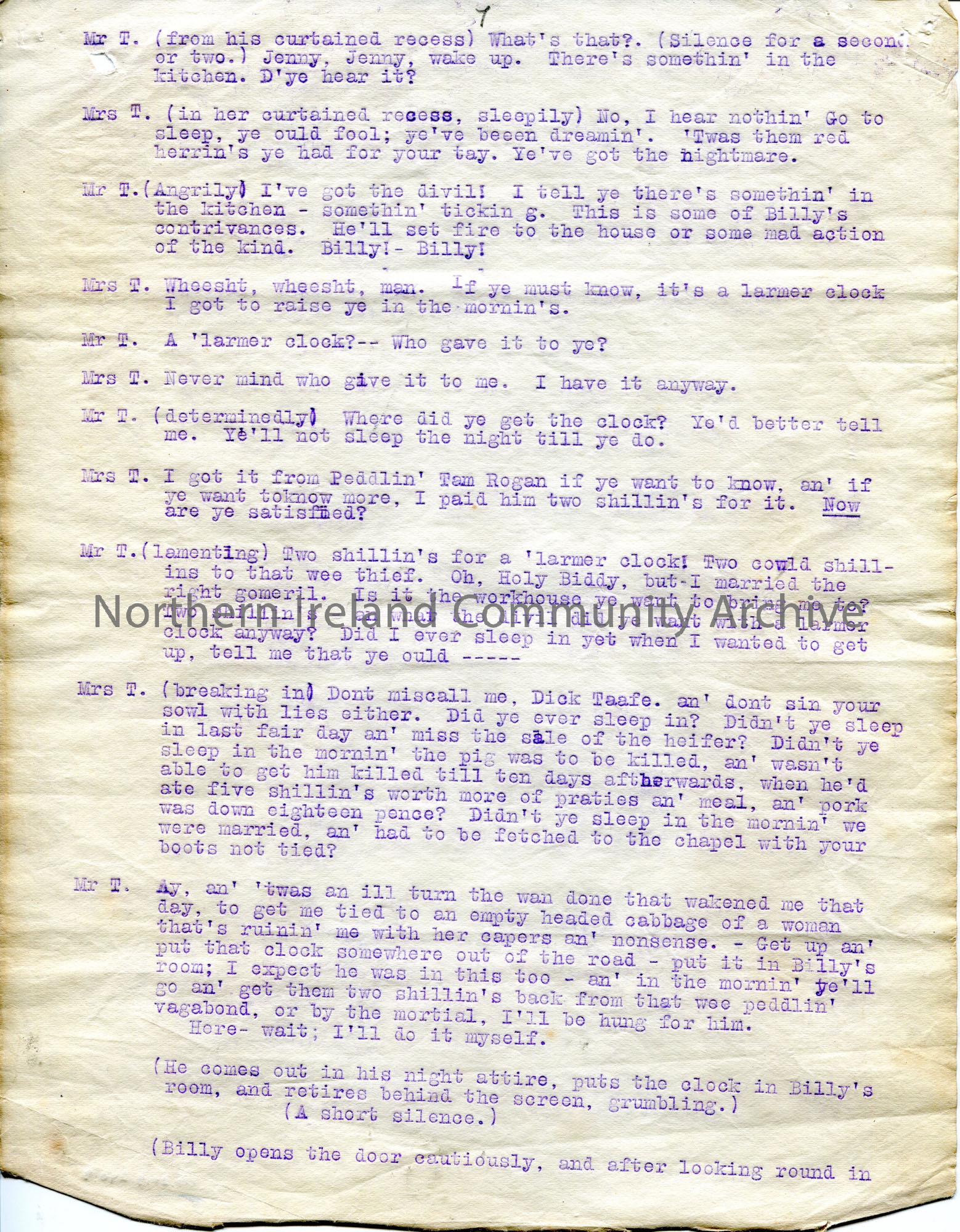 Page 9 of 16. Typed script for play ‘The Alarm Clock. A farce in one act by Lynn Doyle’. Re an alarm clock which is mistaken for an explosive device.