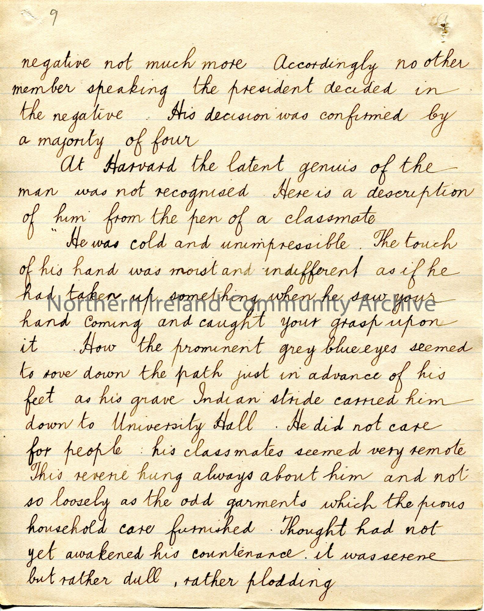 Page 9 of 38. Handwritten essay by Sam Henry titled, ‘The Hermit of Walden’. Philosophical essay re Henry David Thoreau. Sam presents this essay to th…