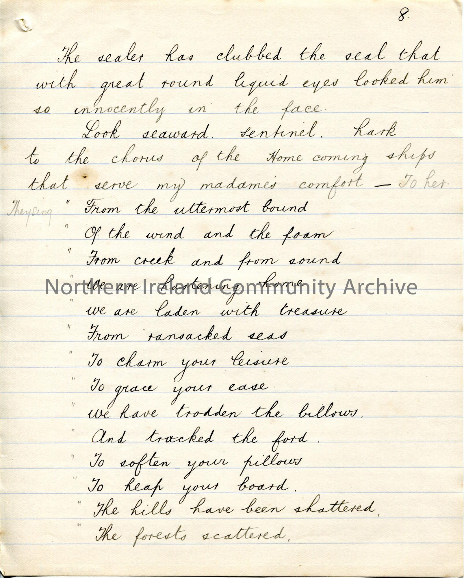 Page 9 of 39. Handwritten essay by Sam Henry titled, 'The Cult of Comfort'. Title is scored out. Dated Omagh, December 1905. Religious, philosophical essay discussing happiness, comfort, charity, love. Includes various songs and poems. Discusses classes, rich and poor.