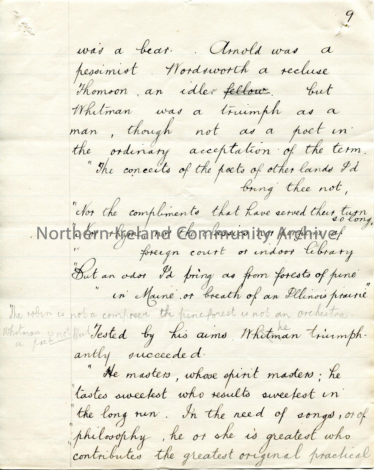 Page 9 of 43. Handwritten essay by Sam Henry titled, ‘Walt Whitman. The Bard of Personality’. Short biography of Whitman and discussion of his poetry.