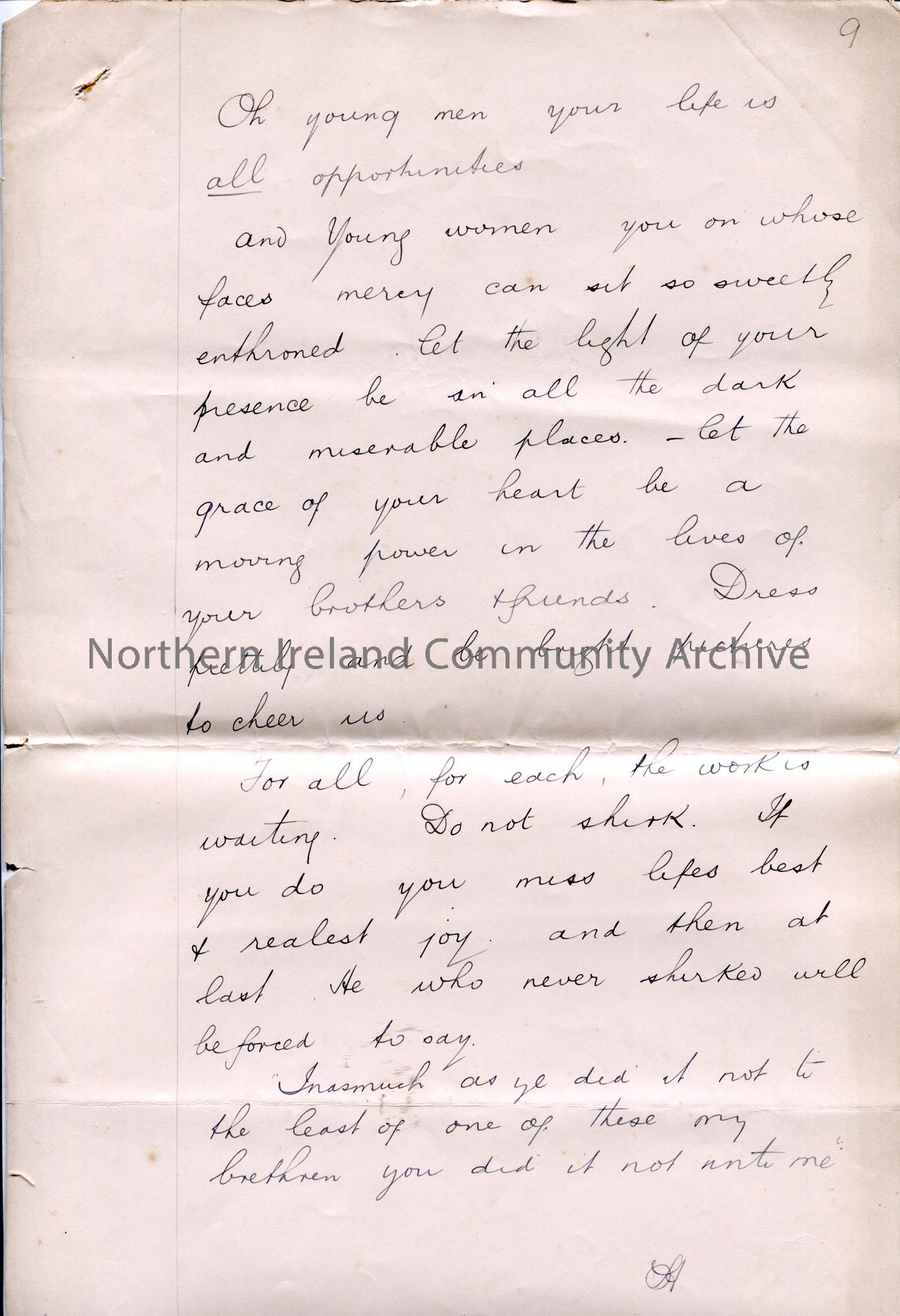 Page 9 of 9. Handwritten essay possibly for lecture titled, 'The Shirker' by Sam Henry. Appears to address the 'Association' New Row? Refers to the town of Coleraine. Asks people if they are workers or shirkers. Encourages people to be proactive in their work and lives.