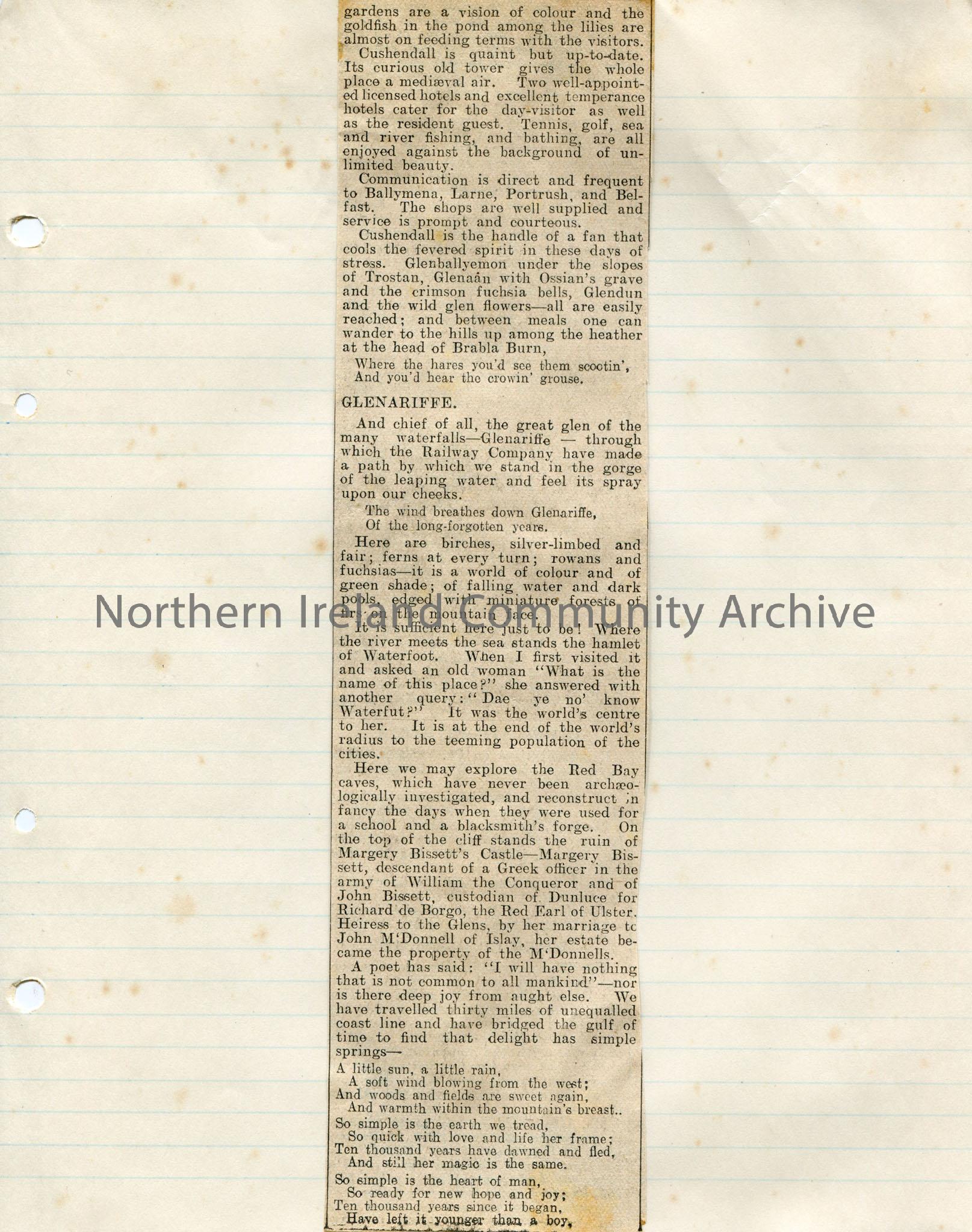 Page 9 of 9 of newspaper cuttings stuck to lined paper titled, ‘Causeway to Cushendall. Beauty of Dalriada Seaboard. Antrim’s Incomparable Coast.’ Art…