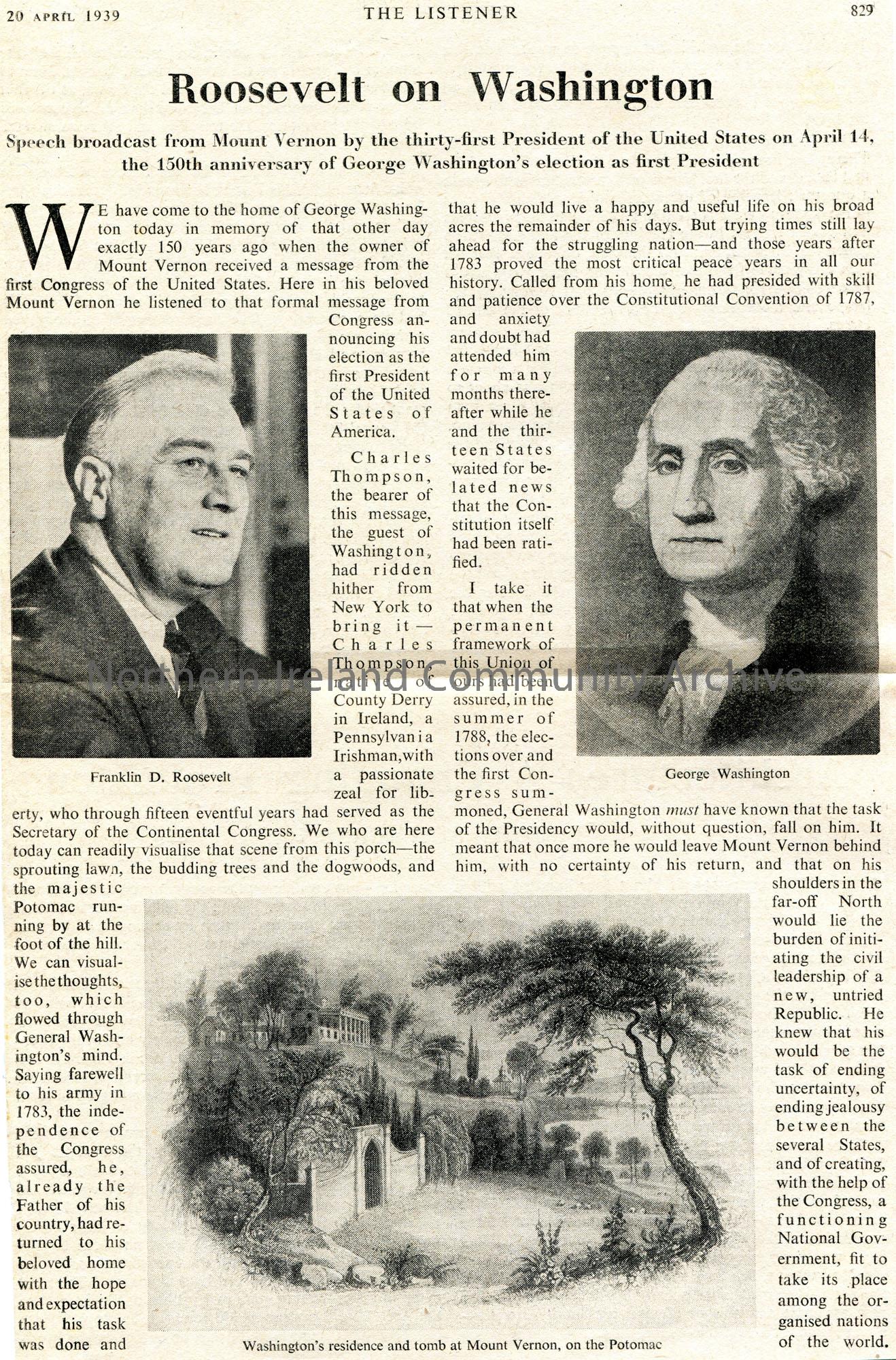 Page cut from a publication - 'The Listener'. Article titled, 'Roosevelt on Washington'. Re speech broadcast by President Roosevelt on 150th anniversary of appointment of George Washington as President of America. Article mentions Charles Thompson as bearer of message to Washington of the news he has won the Presidency. Mentions his other links with the Presidency.