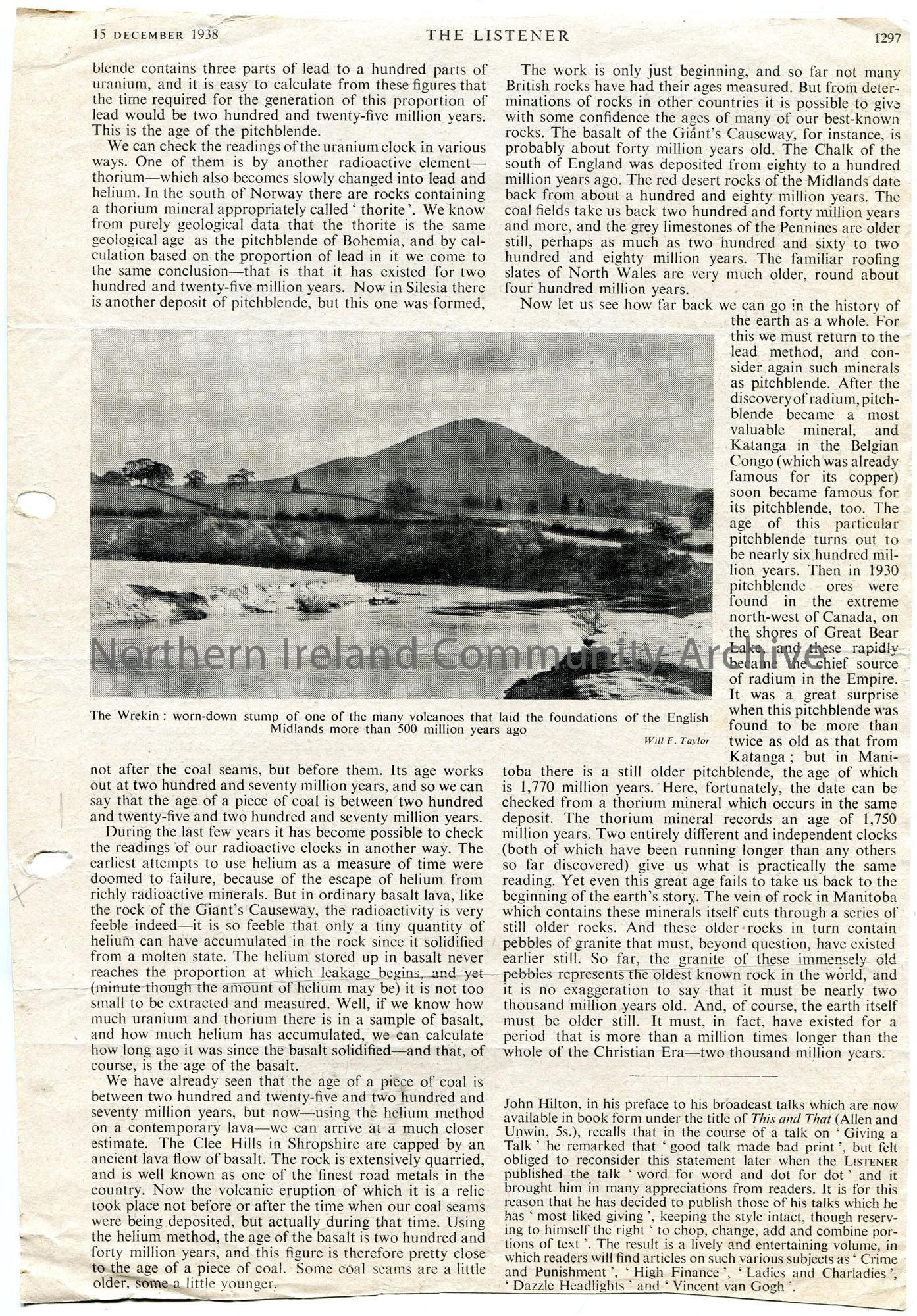 Page cut from 'The Listener' publication (double sided) featuring an article which mentions the Giant's Causeway. Dated 15th December 1938.