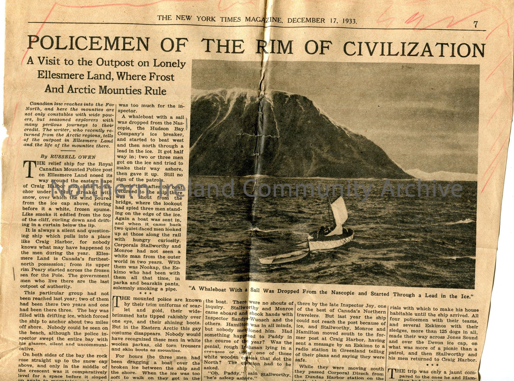 Page cut from ‘The New York Times Magazine’. Article titled, ‘Policemen of the Rim of Civilization’ by Russell Owen. Re Ellesmere Land and the Bache P…