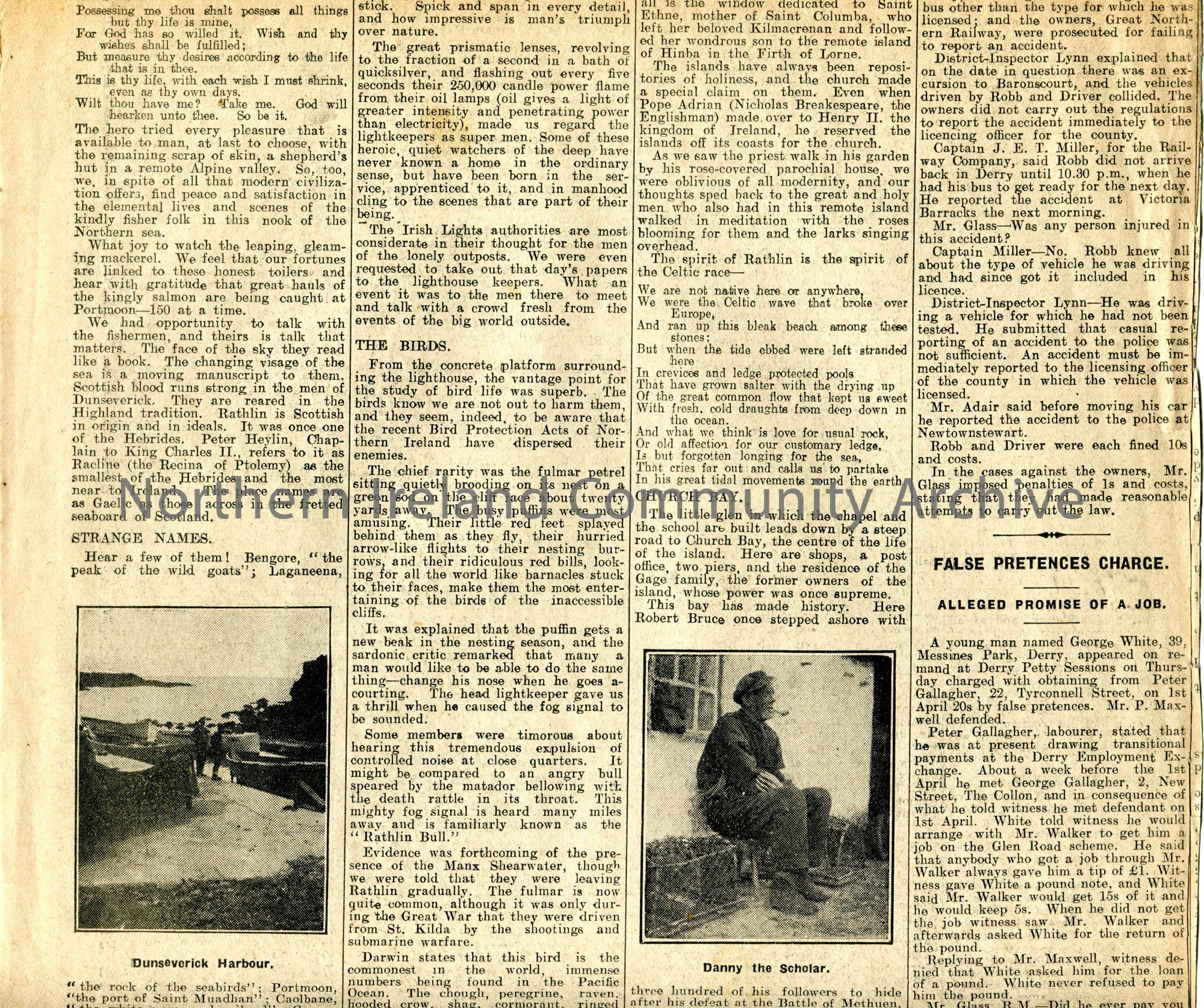 Page cut from the Northern Consititution newspaper, 8th July 1933. Features an article titled, 'In Search of Ulster. By Marchfut to Raghery. Among the Bays, Bens and Birds'. Re an outing by the Route Naturalists' Field Club to Rathlin Island. Four photographic images placed within article titled, 'Dunseverick Castle', 'Dunseverick Harbour', 'Rathlin Harbour' and 'Danny the Scholar'.
