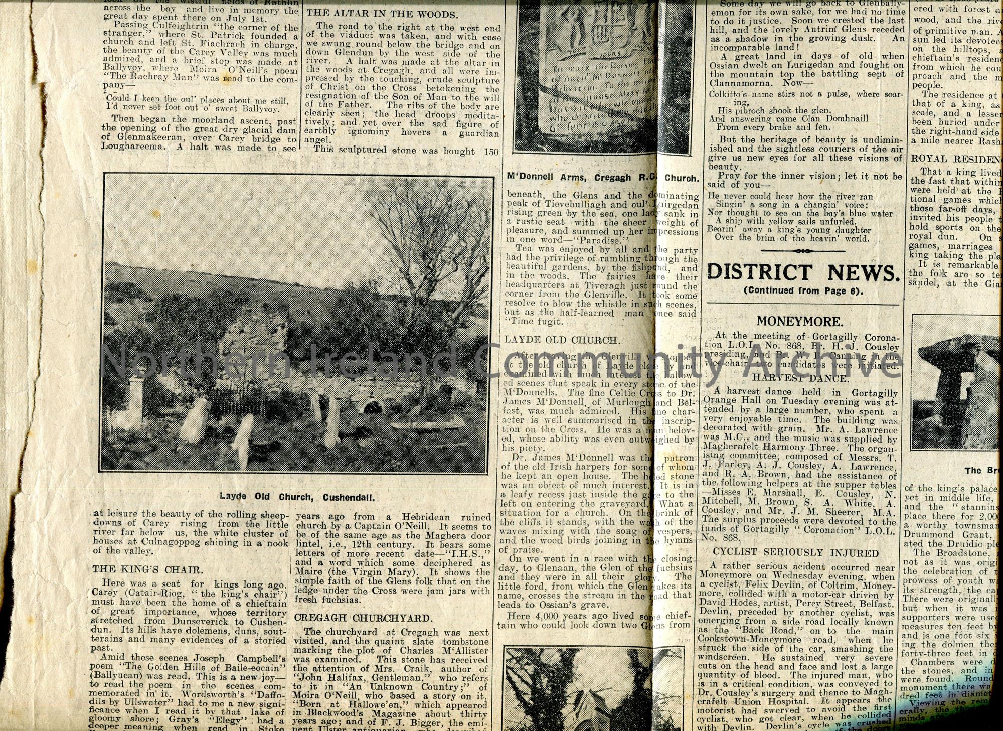 Page cut from the Northern Constitution newspaper, 16th June 1933. Features two articles. Titled, 'Three Antrim Glens. Glendun, Glenaan, and Glenballyemon. A Storied Land of Beauty'. Re an excursion by members of the Route Naturalists' Field Club to the Glens of Antrim. Five photographic images within article captioned, 'Layde Old Church, Cushendall', 'M'Donnell Arms, Cregagh R.C. Church', 'Celtic Cross at Layde (In memory of Dr. James M'Donnell)', 'Cregagh R.C. Church', and 'Tombstone at Cregagh'. The second article on the same page is titled, 'Local Antiquities. Relics of a Great Past. The Broadstone'. 3 photographic images feature within the article captioned, 'The Broadstone', 'Old Font', and 'Bell-rope Stone'. These images were taken by Mr D. Biggart, Ballymoney.