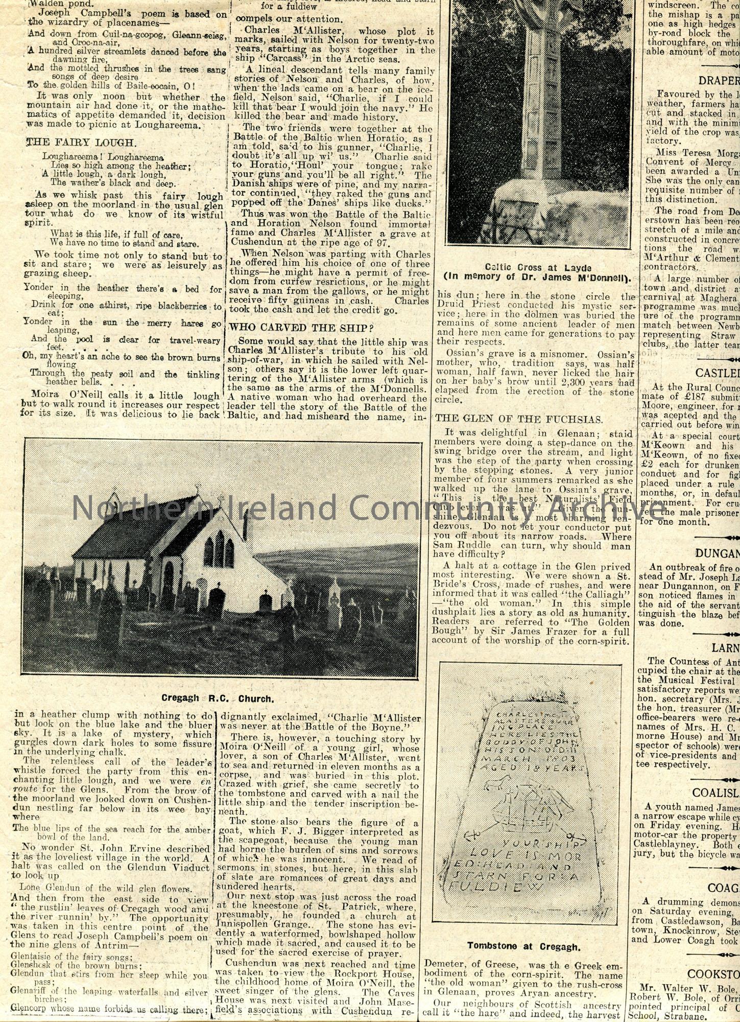 Page cut from the Northern Constitution newspaper, 16th June 1933. Features two articles. Titled, 'Three Antrim Glens. Glendun, Glenaan, and Glenballyemon. A Storied Land of Beauty'. Re an excursion by members of the Route Naturalists' Field Club to the Glens of Antrim. Five photographic images within article captioned, 'Layde Old Church, Cushendall', 'M'Donnell Arms, Cregagh R.C. Church', 'Celtic Cross at Layde (In memory of Dr. James M'Donnell)', 'Cregagh R.C. Church', and 'Tombstone at Cregagh'. The second article on the same page is titled, 'Local Antiquities. Relics of a Great Past. The Broadstone'. 3 photographic images feature within the article captioned, 'The Broadstone', 'Old Font', and 'Bell-rope Stone'. These images were taken by Mr D. Biggart, Ballymoney.