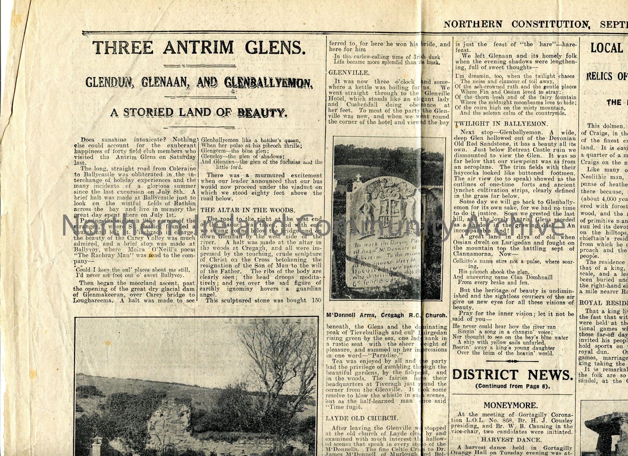 Page cut from the Northern Constitution newspaper, 16th June 1933. Features two articles. Titled, 'Three Antrim Glens. Glendun, Glenaan, and Glenballyemon. A Storied Land of Beauty'. Re an excursion by members of the Route Naturalists' Field Club to the Glens of Antrim. Five photographic images within article captioned, 'Layde Old Church, Cushendall', 'M'Donnell Arms, Cregagh R.C. Church', 'Celtic Cross at Layde (In memory of Dr. James M'Donnell)', 'Cregagh R.C. Church', and 'Tombstone at Cregagh'. The second article on the same page is titled, 'Local Antiquities. Relics of a Great Past. The Broadstone'. 3 photographic images feature within the article captioned, 'The Broadstone', 'Old Font', and 'Bell-rope Stone'. These images were taken by Mr D. Biggart, Ballymoney.
