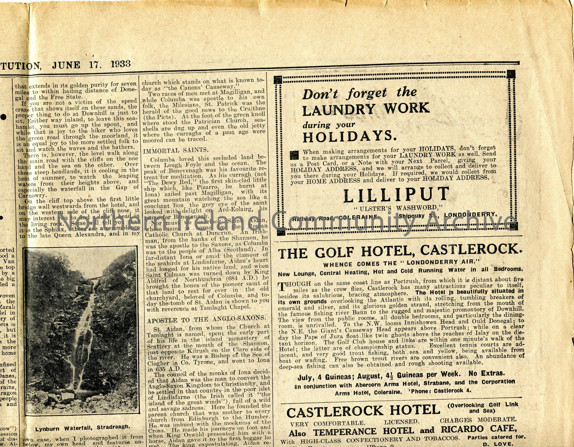 Page cut from the Northern Constitution newspaper, 17th June 1933. Features an article titled, ‘From Bann to Foyle. Castlerock, Downhill, Magilligan. … – scan006e
