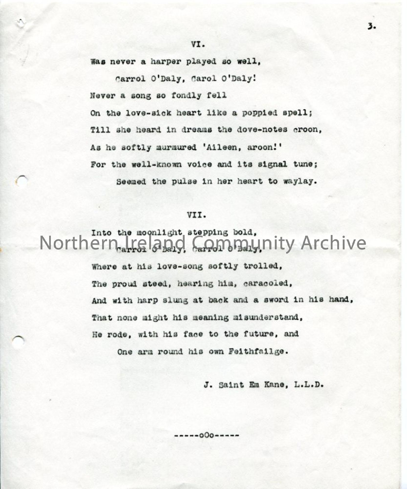 Page five: typed page re: 'Carrol O'Daly' and the air 'Eileen Aroon', along with the words to the song. A popular Irish air, sometimes regarded as a Scottish air.