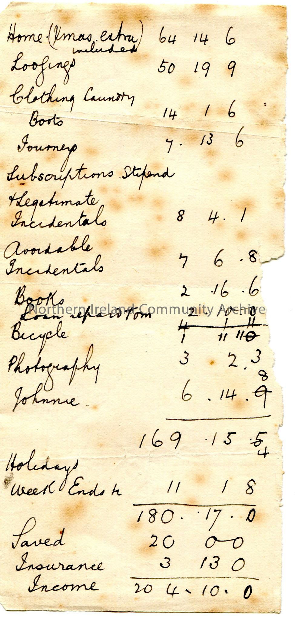Page found within CM:2017:1898.1 at end of April and start of May. List of expenses handwritten in ink on one side and pencil sketch of map re Omagh o…