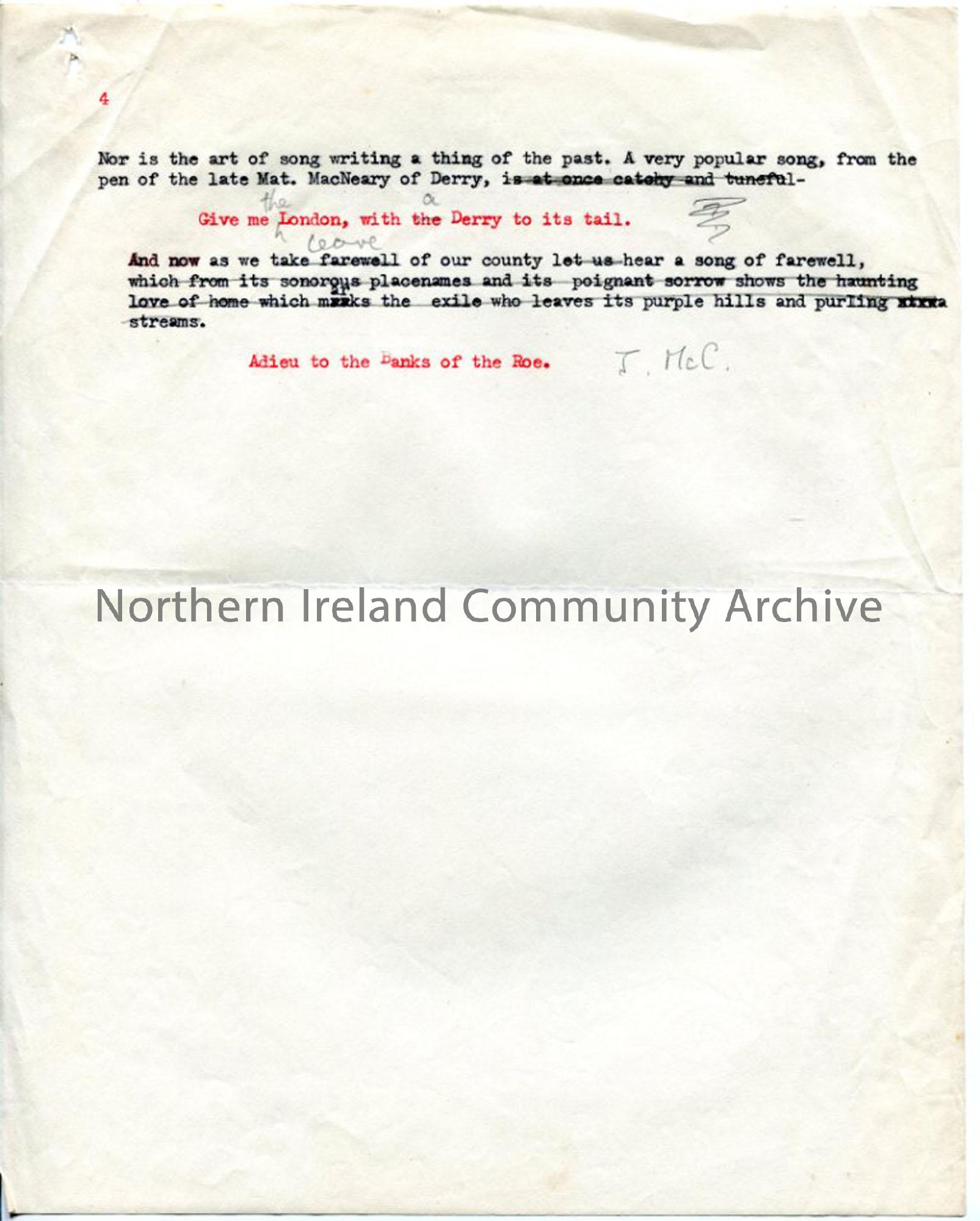 One of 4 typed pages and small attached typed note - 'The Music of County Londonderry'. Appears to be rough, corrected script for broadcast, giving history from ancient times, with song titles for singing/playing interspersed at intervals. Includes Rory Dall O'Cahan, the blind harper.