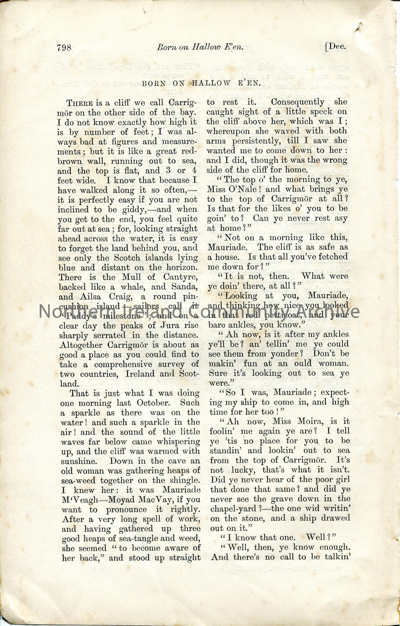 Page from a book, chapter titled, 'Born on Hallow E'en'. December 1890, Moira O'Neill. Pages 797-798.